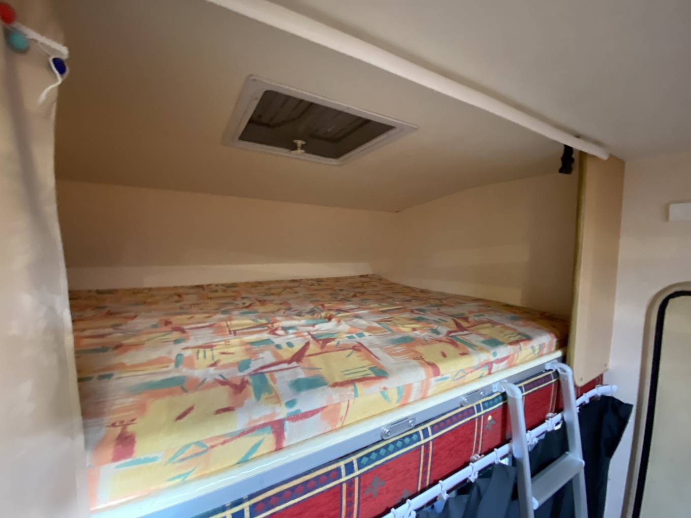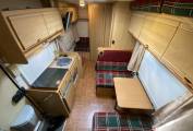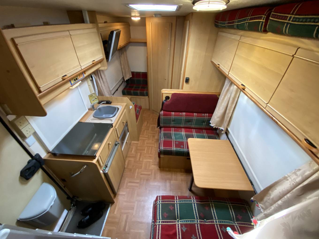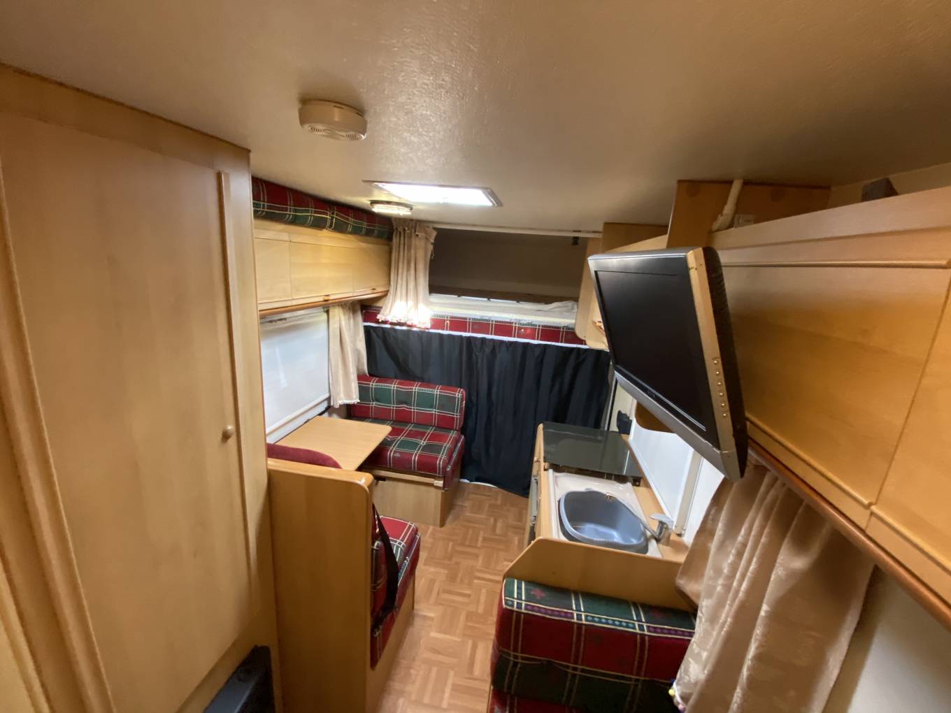 On entering via the double electric step to your right is the drivers cab above which is a huge fixed double bedroom with its own side window and rooflight. A security net and a curtain close this off to the living area.