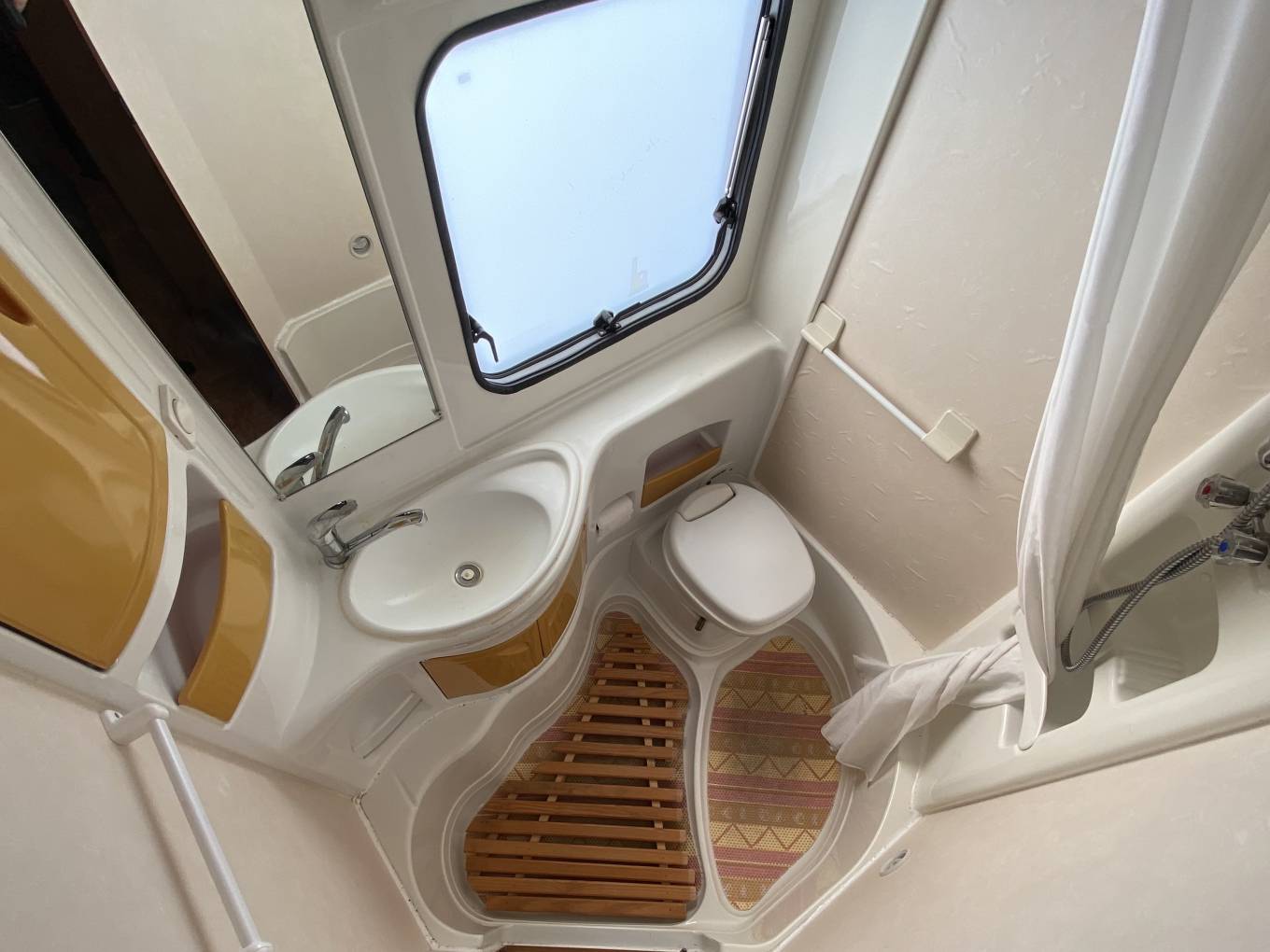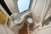 The spacious bathroom is in one rear corner containing a Thetford cassette toilet, a wash handbasin and a shower that curtains off from the rest of the room.