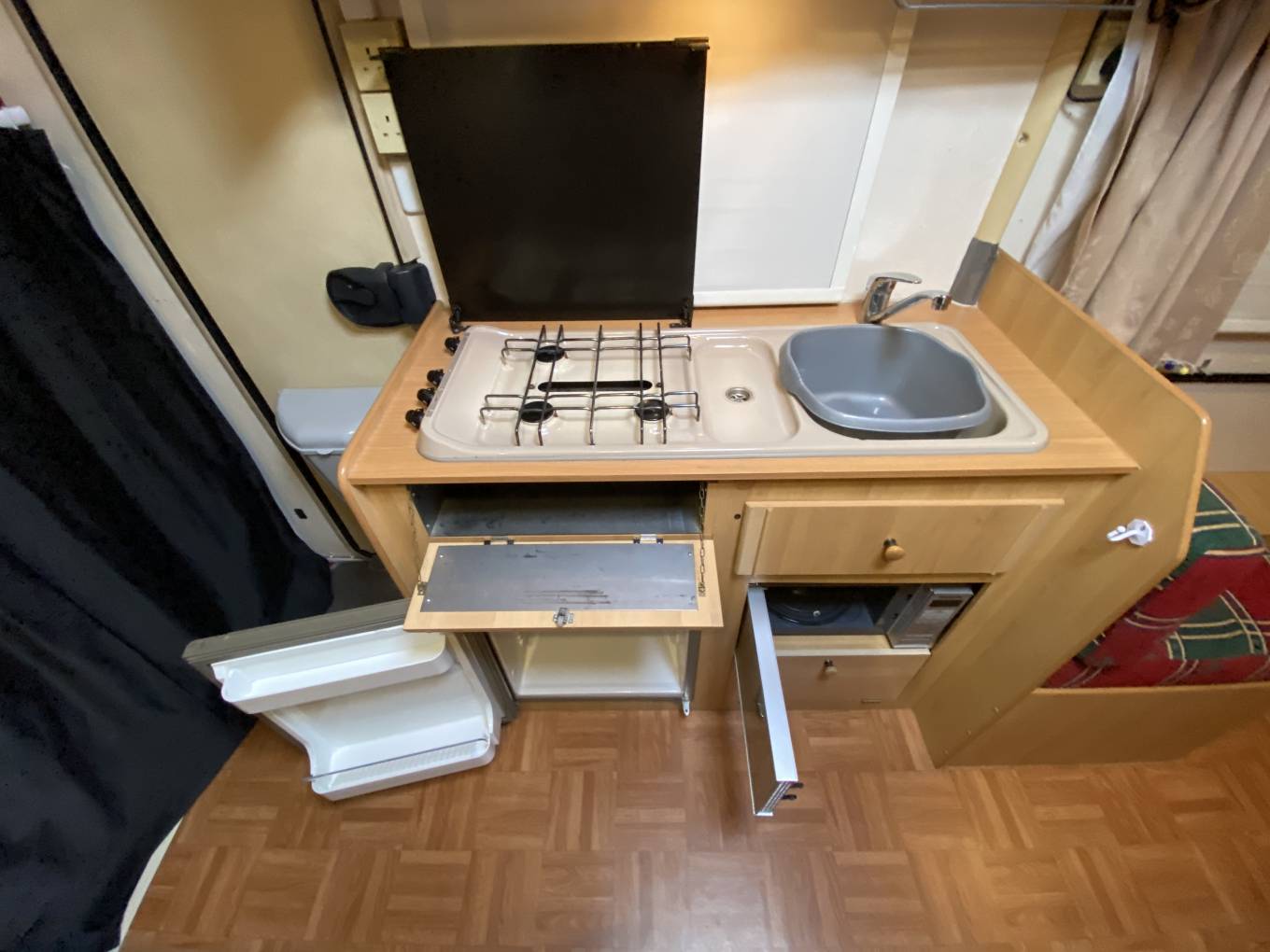 To your left is the kitchen where you will find a three burner hob, a grill, a sink with drainer, a microwave oven, a three energy source Electrolux fridge and plenty of cupboard space.