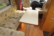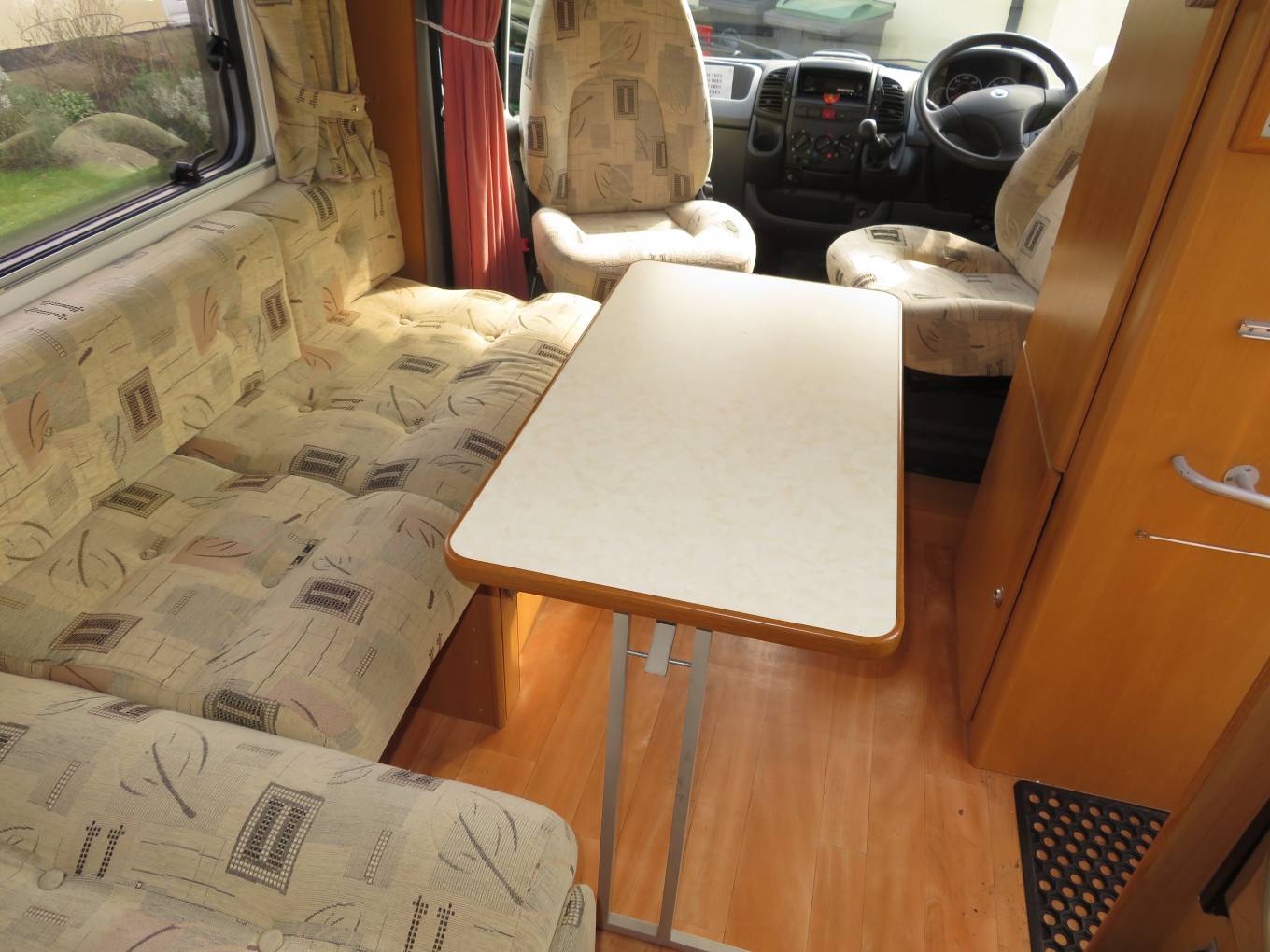 The motorhome really does have an excellent layout and as mentioned previously is really an ideal motorhome for two people, with the option to take a further two if you wish. At the front of the motorhome there is a large spacious lounge area which uses a long L shaped sofa and the two front captains chairs that can be swivel round. There is also a cleverly stored folding table that can be set up in the centre of this area to create the ideal spot to enjoy an evening meal or snack.