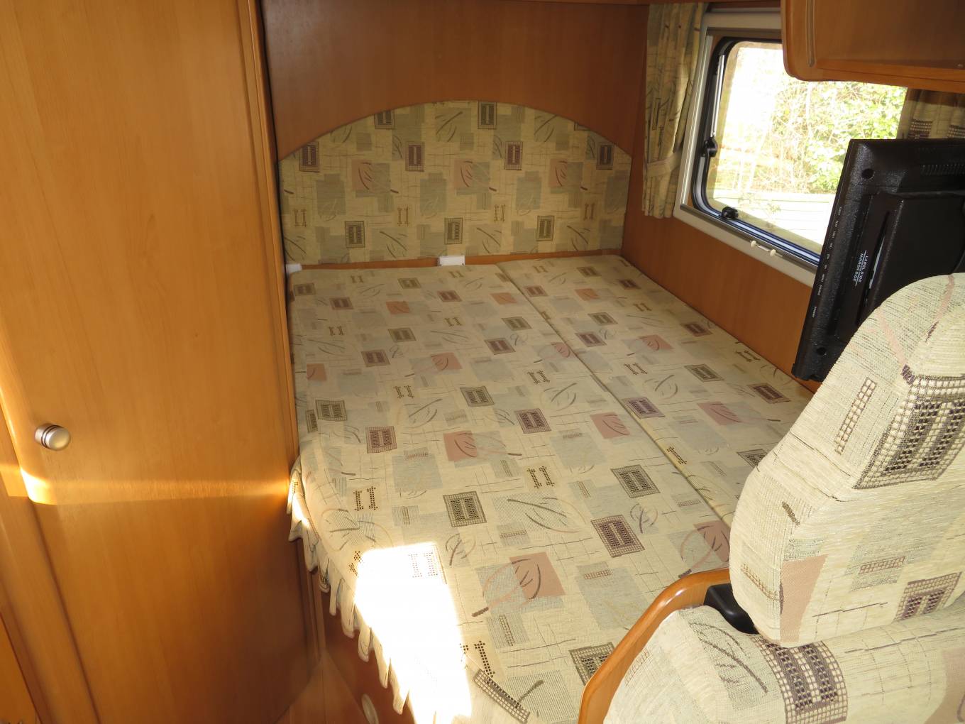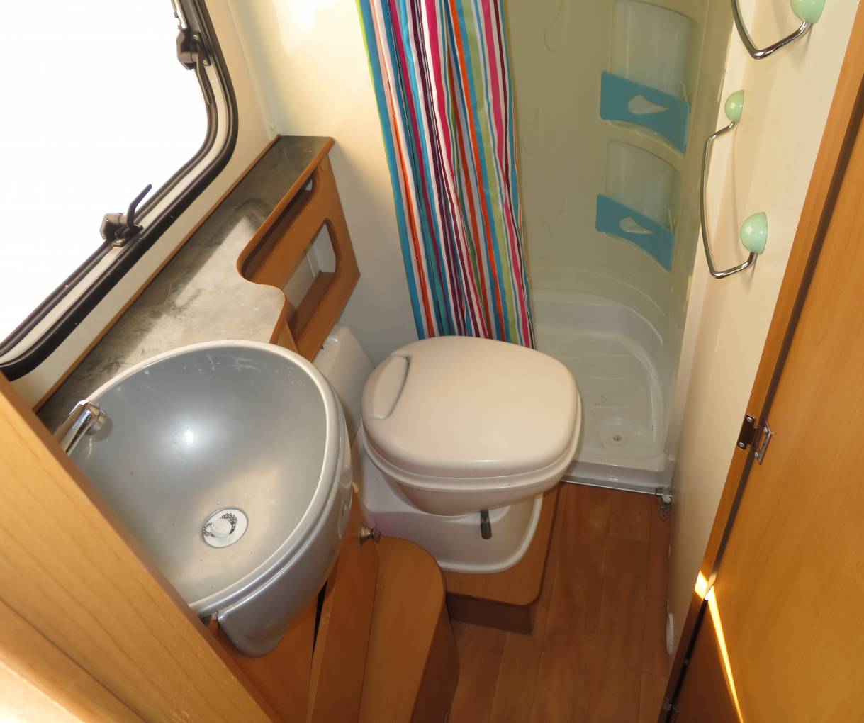 At the very rear of the motorhome there is an extremely comfortable fixed French bed so no need to keep making up the bed each day. There is also plenty of storage cupboards all around and further storage is available under the bed. Also at the rear of the motorhome is a generous washroom with Thetford Flush cassette toilet, vanity basin and separate shower to keep you nice and fresh.