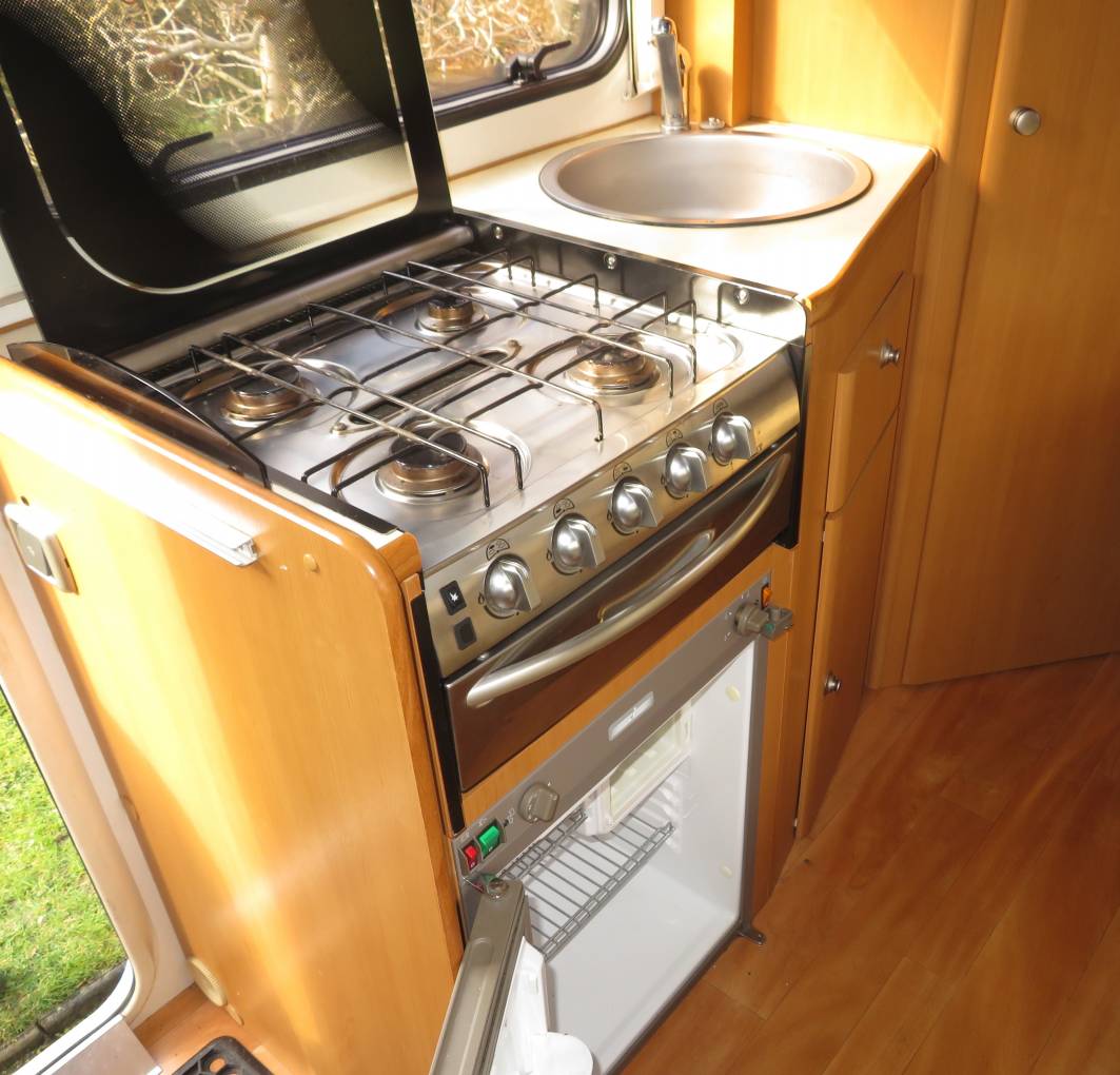 As you move back in the habitation area you have a well equipped kitchen with hob with 4 gas burners and grill but one thing to note is that there is no oven in this motorhome. There is as a 3-way fridge with ice box and sink with mixer tap. One of the previous owners has also created an additional shelf that can be put up when in the kitchen to create extra work space.