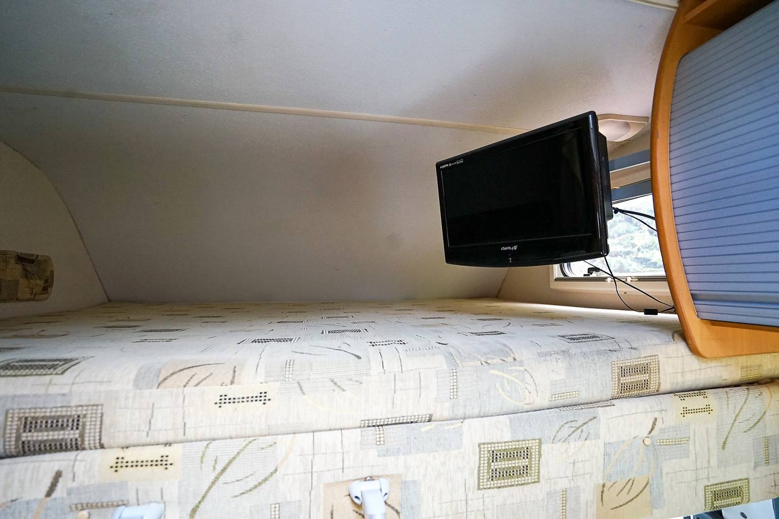 double bed with fitted TV. Double dinette with 4 rear seat belts and tall wardrobe.