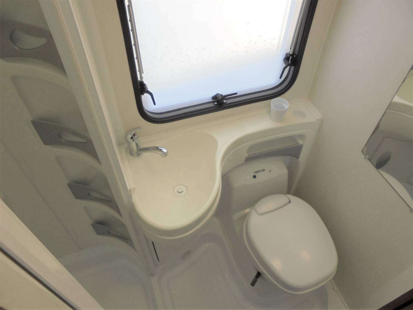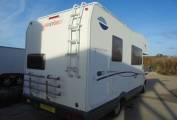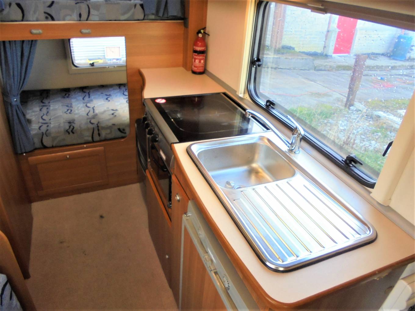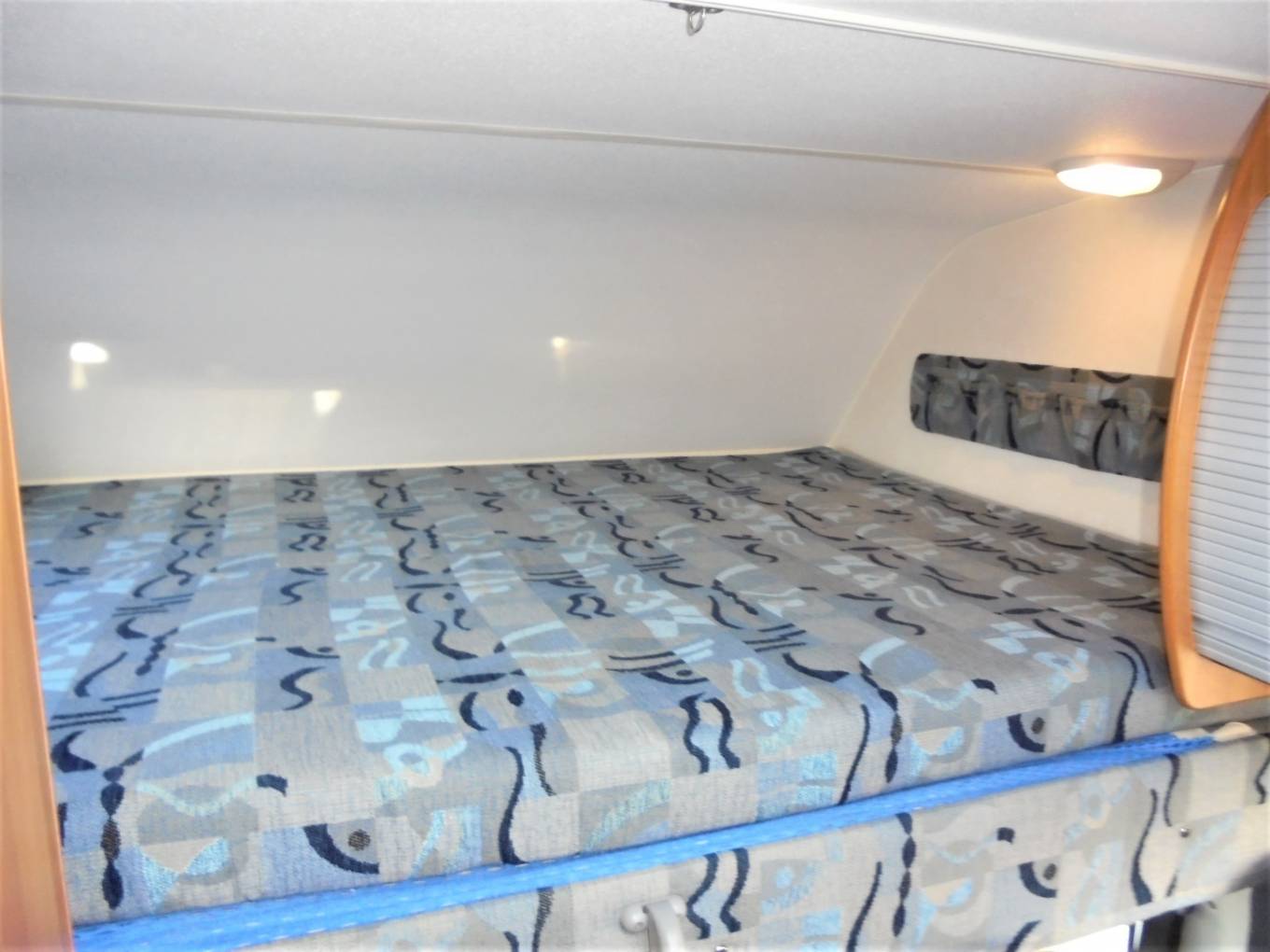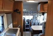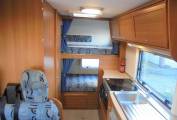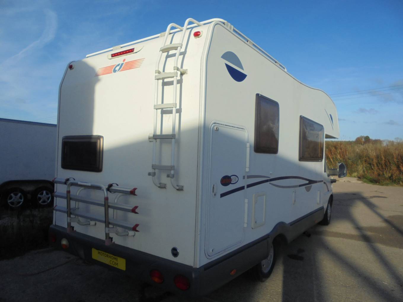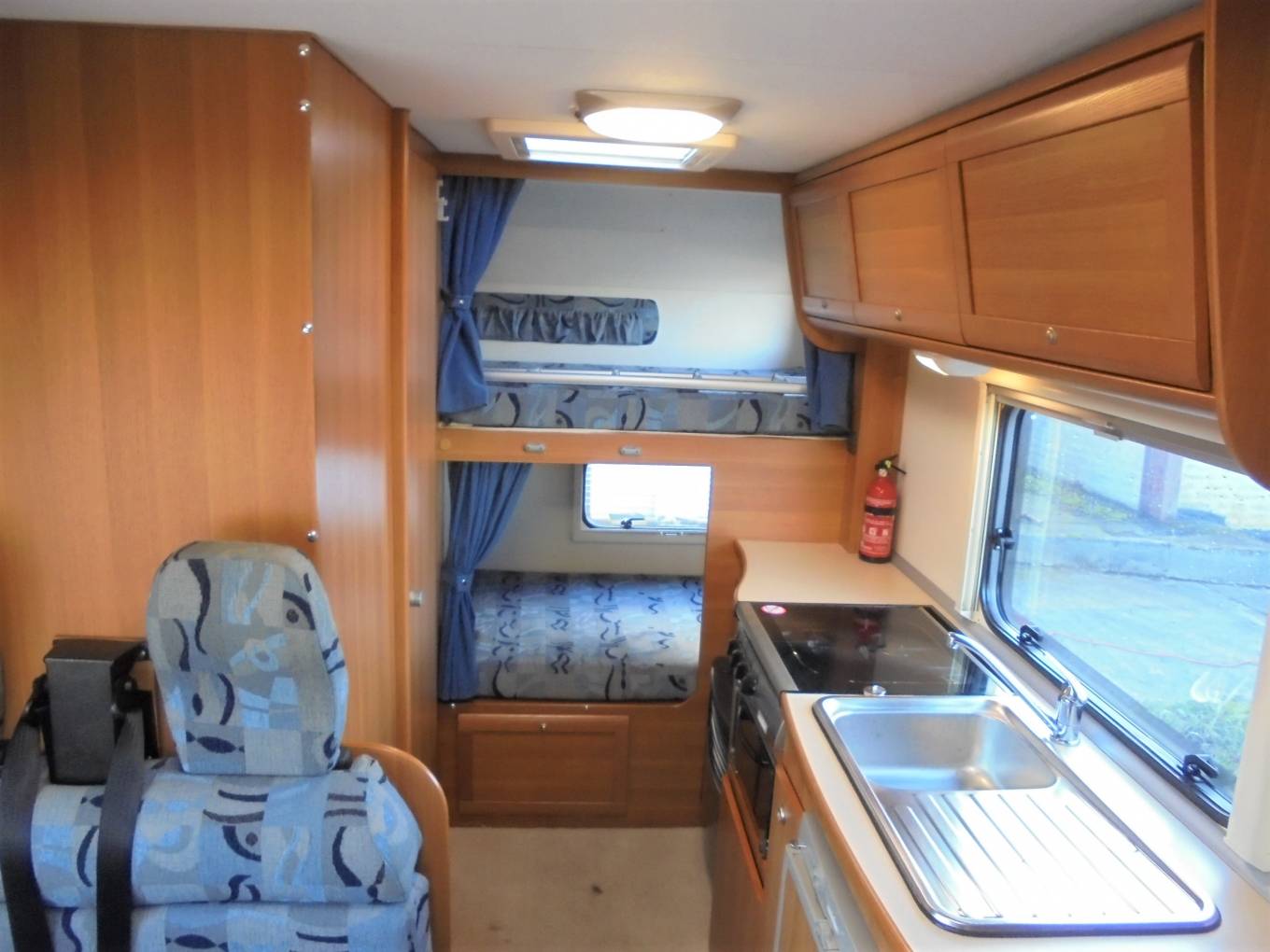 Ci Carioca 656 6 berth motorhome with 6 seat belts. Layout is front lounge and dining area which converts to double bed, central kitchen, central washroom, two rear bunk beds over the rear garage. Front over cab double bed. The kitchen area has a hob with 4x gas ring, sink, oven-grill combi and fridge with separate freezer compartment which operate on gas or electric. Heating and hot water operate on gas or electric. The washroom has electric flush cassette toilet, sink and shower enclosure. The motorhome has a directional TV aerial, electric hook up, TV points, 230v and 12v power points and a TV bracket mounting in the lounge area. An Avtex TV/DVD is included in the sale. Outside the motorhome is a solar panel, an awning canopy and a rear garage.