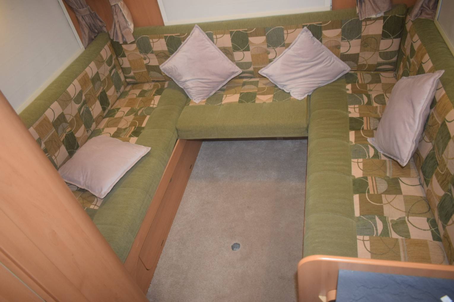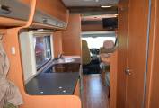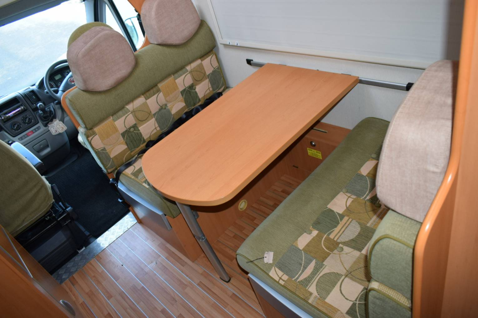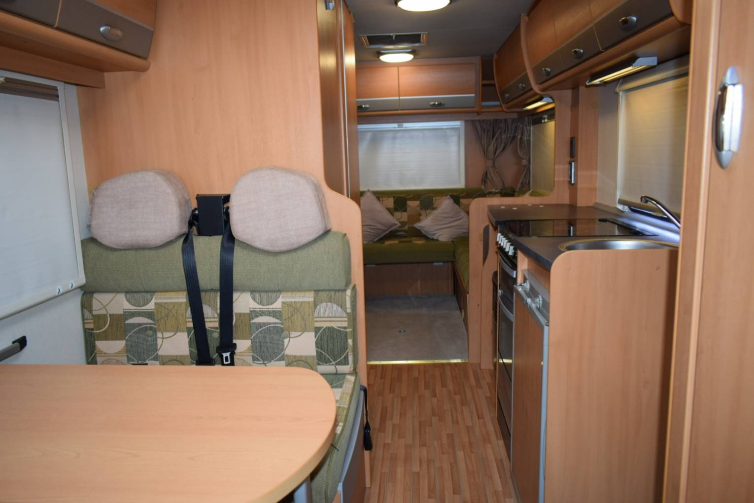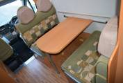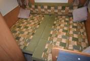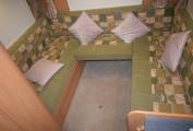 On entering via the UK side habitation door which has a useful flyscreen, to your left is the wardrobe and in front of you the four person dinette which converts to a double bed. Over the cab is a huge pull down double bed making an ideal den for children with its own windows and lighting.