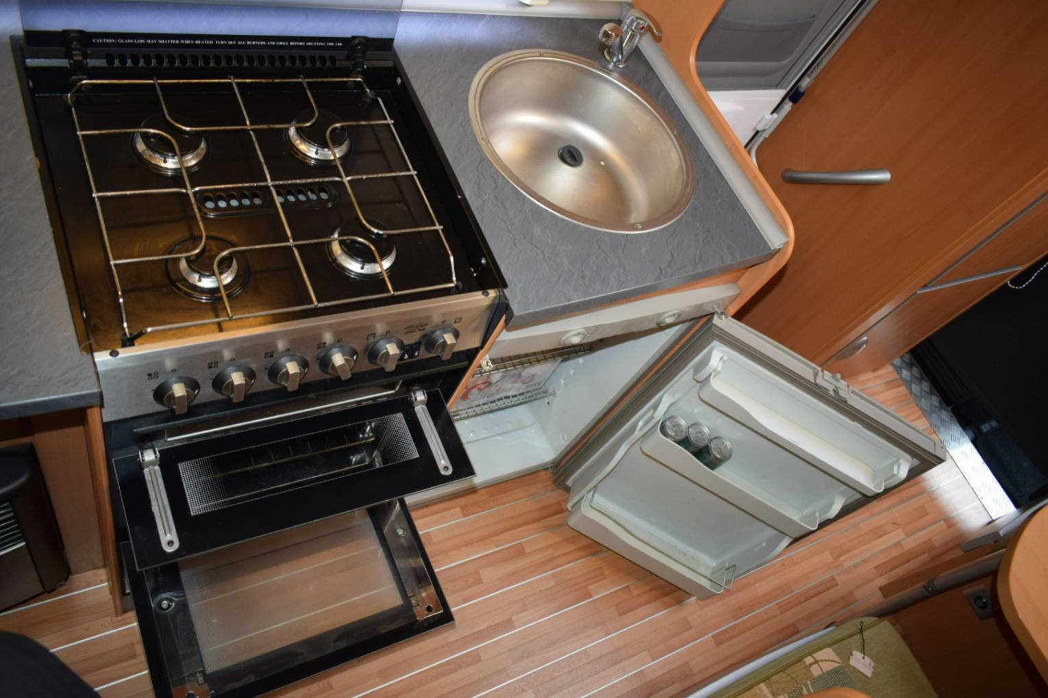 To the right of the entrance door is the kitchen comprising of a four gas burner hob, separate grill and oven, sink and a three energy source Dometic fridge all complemented by a large worktop area and plenty of cupboard space.