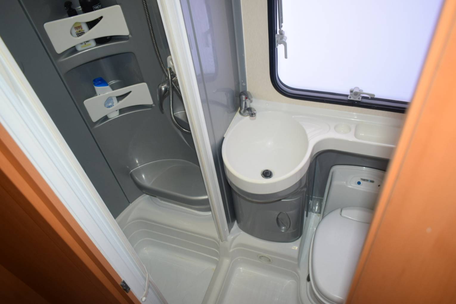 Opposite is the bathroom where you will find a Thetford Toilet, Wash Handbasin and a separate shower cubicle.