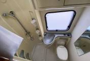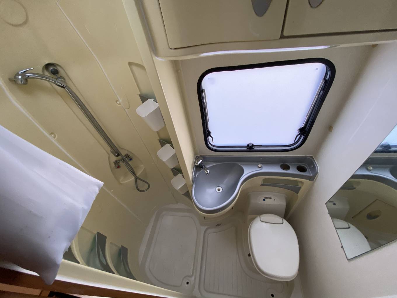 In the opposite corner is the bathroom comprising of a Thetford toilet, wash hand basin, cupboards and a separate shower.