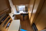 On entering via the habitation door, which is towards the rear of the driver’s side, you will find the kitchen across the back of the motorhome. Here is a four gas burner hob, grill, sink with drainer and plenty of cupboard space. Inside these cupboards is a microwave oven, electric kettle and more. The three energy source Dometic fridge is to the right on the entrance door.