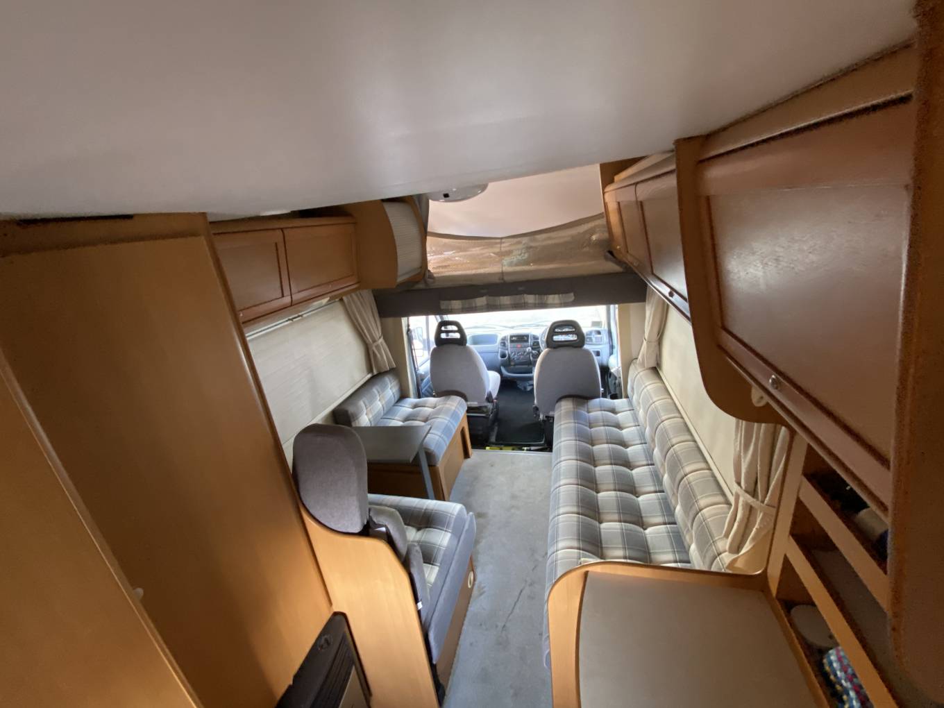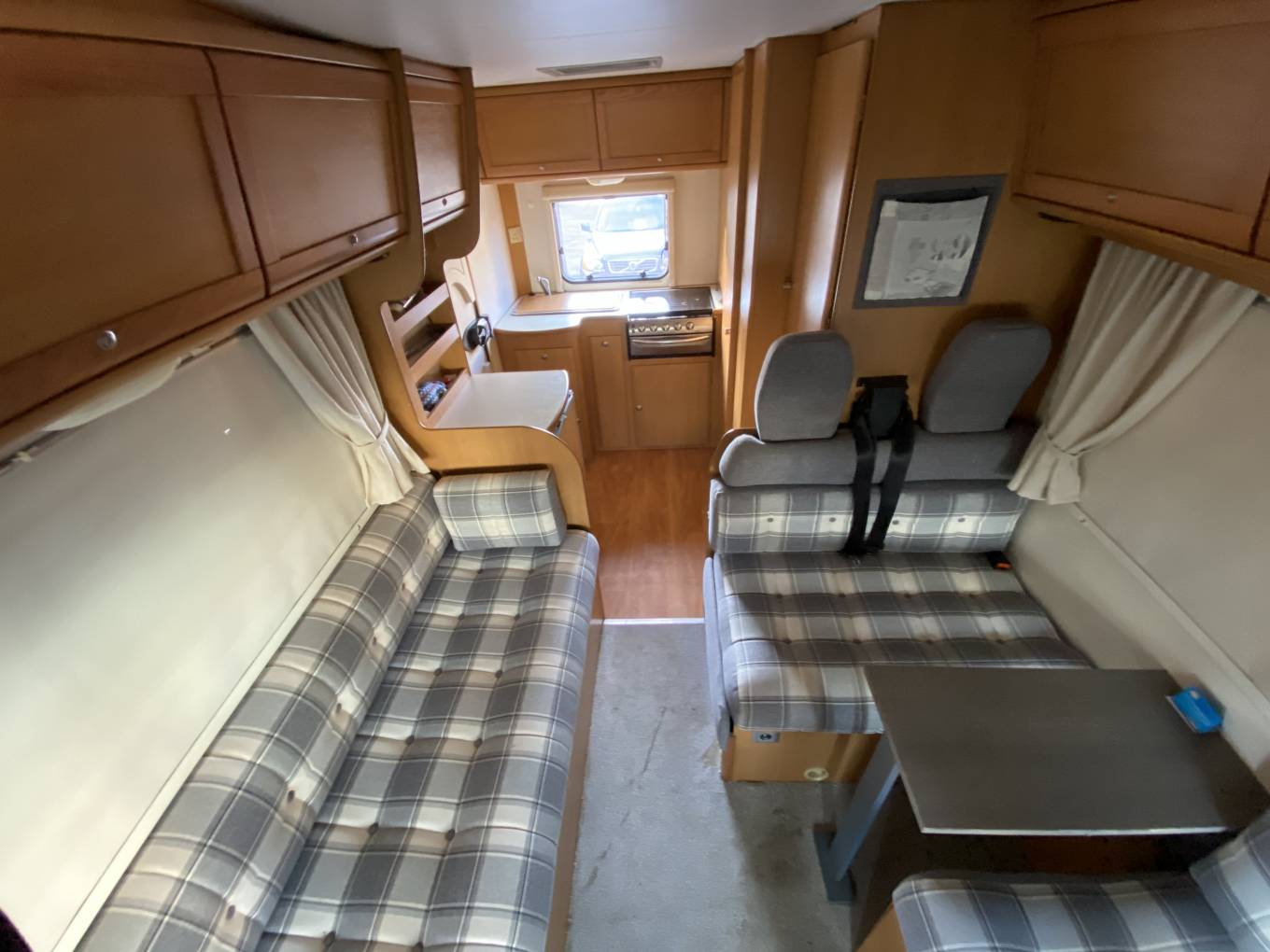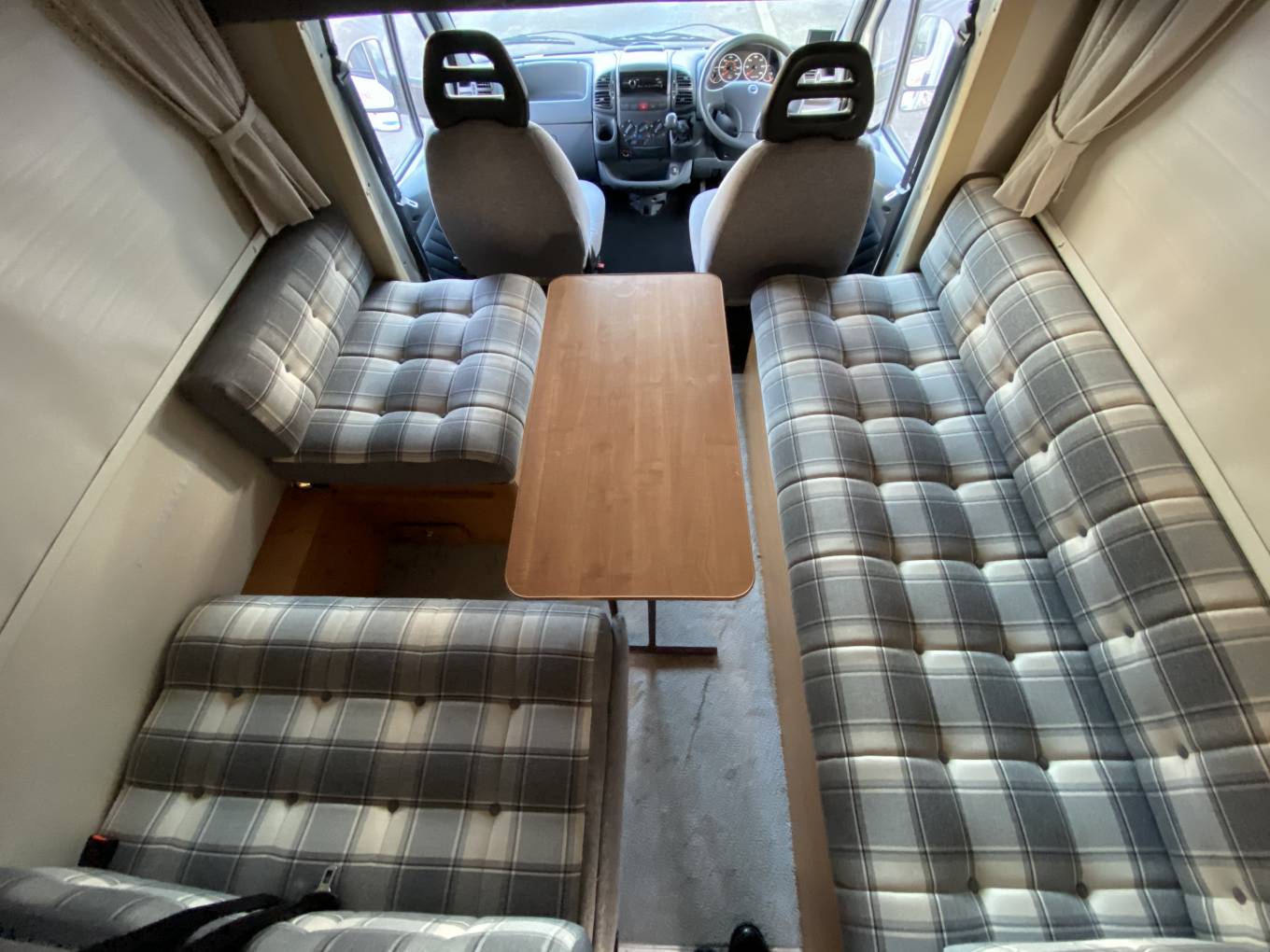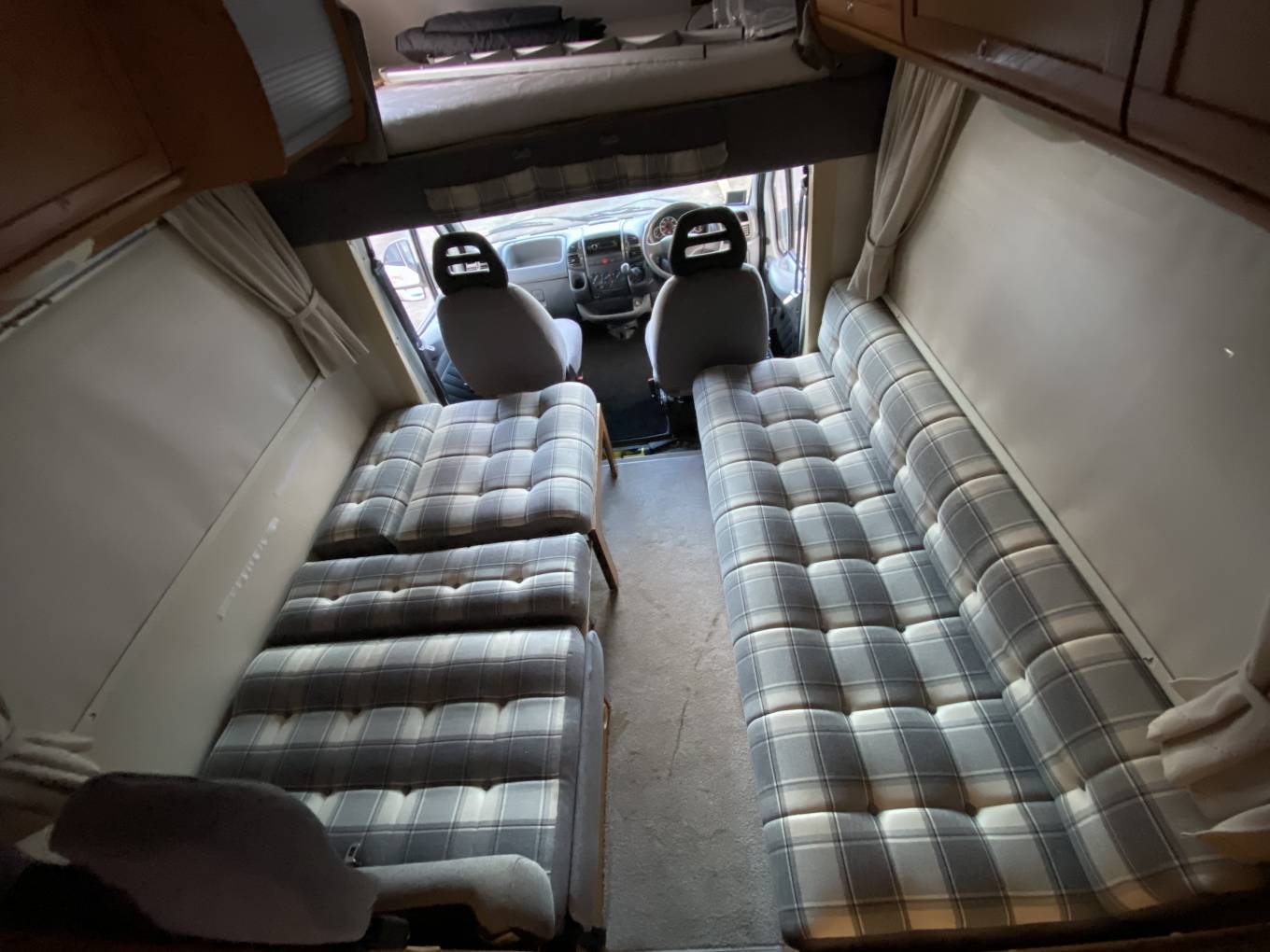 The lounge features a full length settee, two forward facing belted seats and a further single chair plus the swivelling front passenger seat.