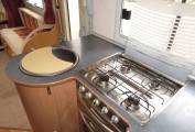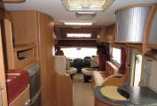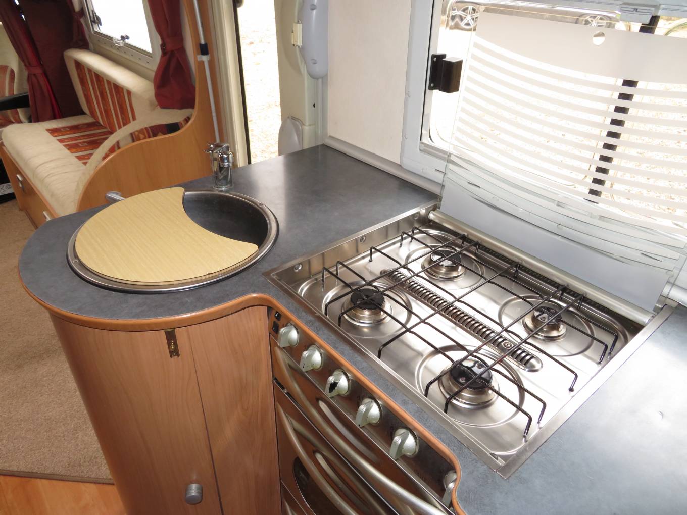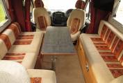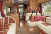 This motorhome has a fantastic living area with a very spacious lounge at the front comprising of an L shaped sofa and an additional side facing double sofa.The front two seats can be swivelled round to create the perfect place for everyone to put their feet up and relax. The lounge has plenty of natural light and also has a TV with integrated DVD player that slides out for all to enjoy. In the centre of the lounge there is a place to put a multi-directional table, the ideal space to enjoy a meal, snack or the odd board or card game.