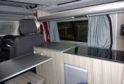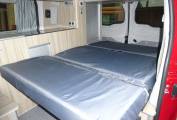 Full side conversion, with extra width bed, including seatbelts and yet still enjoying the home comforts of a Dometic CB40 Top Loader fridge box (12v/240v), Dometic Sink and 2 ring Gas Hob.