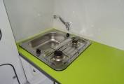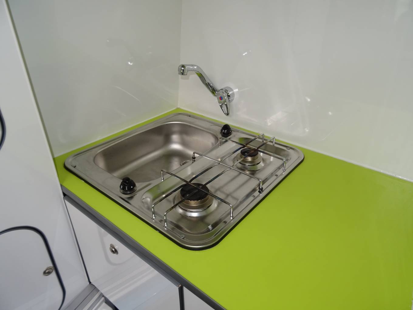 Kitchen equipment consists of a sink with waste water collection ,oven, fridge and there is ample storage for all essentials all over the camper.