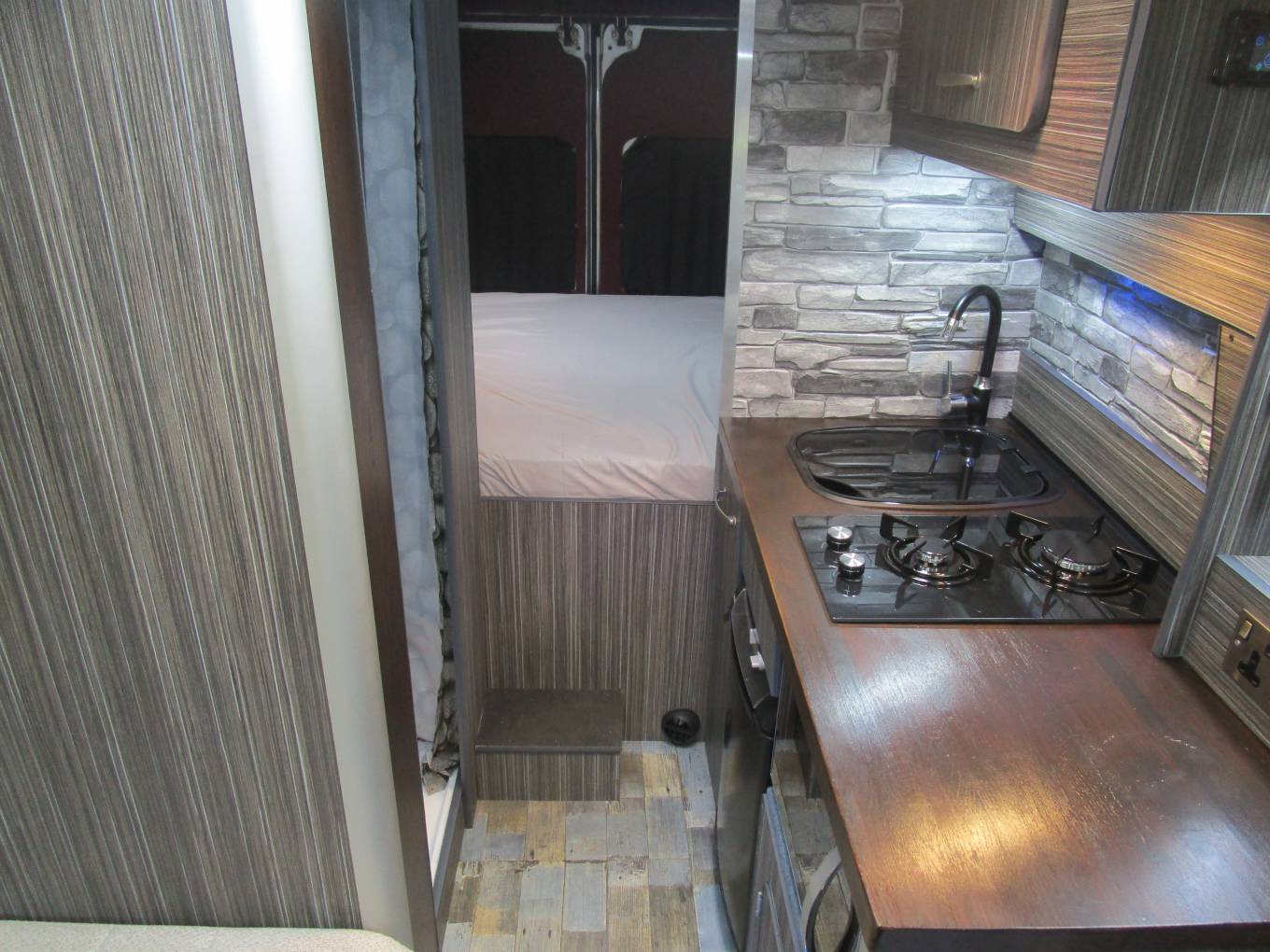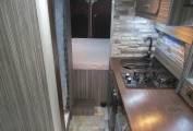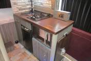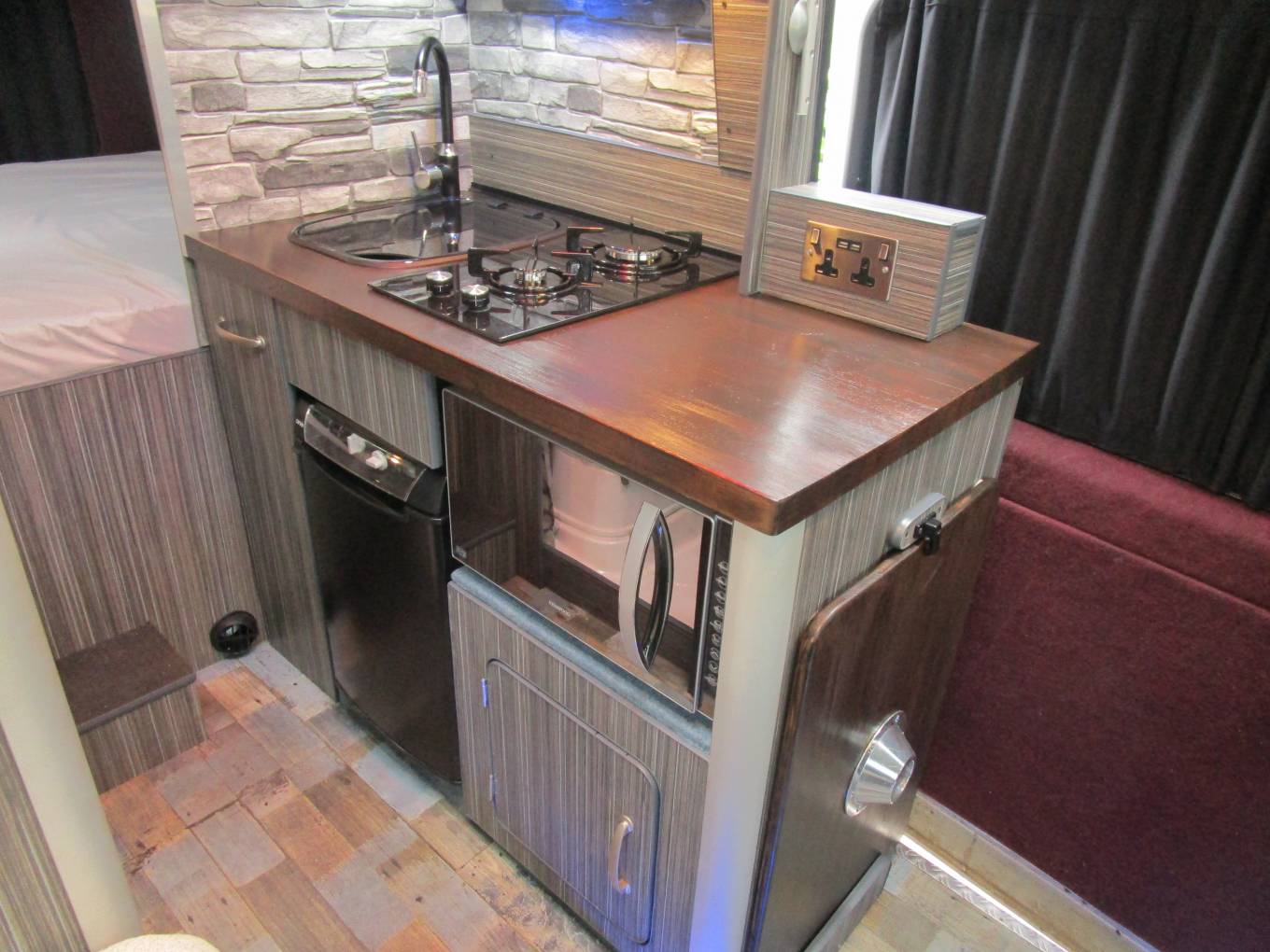 To the centre of the camper you will find the compact washroom which provides a Thetford cassette toilet and shower. The kitchen area is adjacent and is extremely well-equipped offering a sink with hot and cold water, 2 ring gas hob, fridge and combined microwave oven.