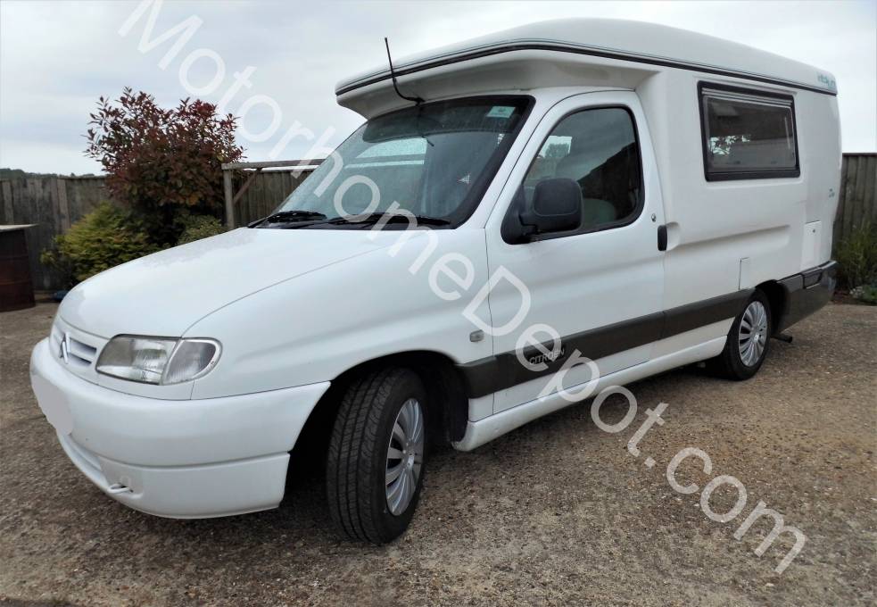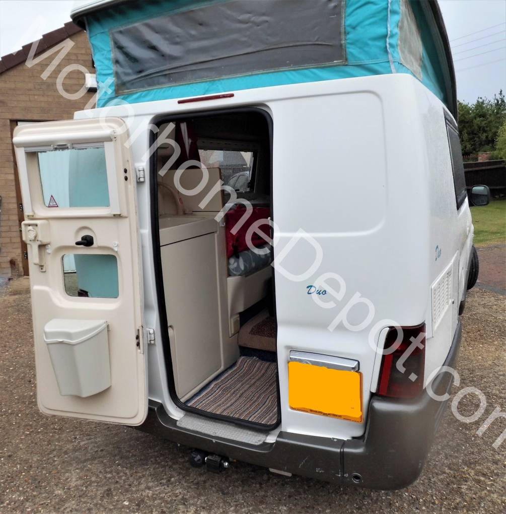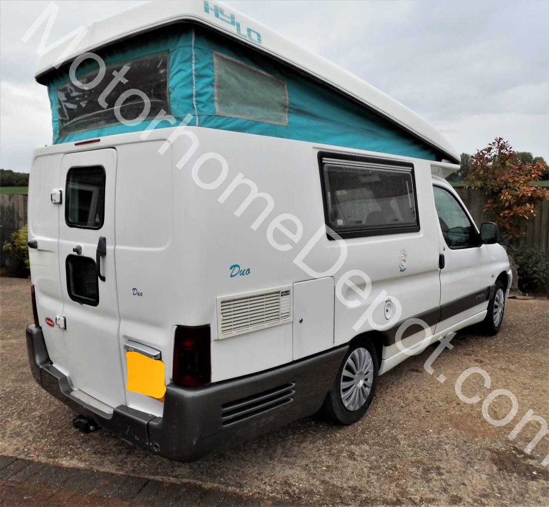 Here we have a Romahome Duo Hylo on a Citroen Berlingo chassis. 1.9 litre diesel engine benefiting from an Autoclutch system which enables the vehicle to be driven in a semi-automatic way. MOT to 31.02.20 with 87073 miles and pop up roof. There is a freestanding canopy as new, that has not been used. At the rear there is a tow hook and entering the rear habitation door, on the right is a 2 burner hob, grill and fridge with freezer box. Opposite is the sink and a Porta Potti 365 toilet in a cupboard below the sink. Moving on to the lounge-dining area, there are 2 long lounge seats that can be used as 2 singles or converts to one double bed. Moving into the cab area, the driver and passenger seats both have 3 point seat belts. There is a fitted radio and silver blackout screen around the cab windows. In the habitation area there are also blackout and fly screens. There is an electric hook-up and leisure battery together with 2 gas cylinders. This is a very well cared for vehicle, perfect for everyday use for two persons and ideal for easy parking.