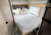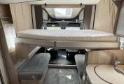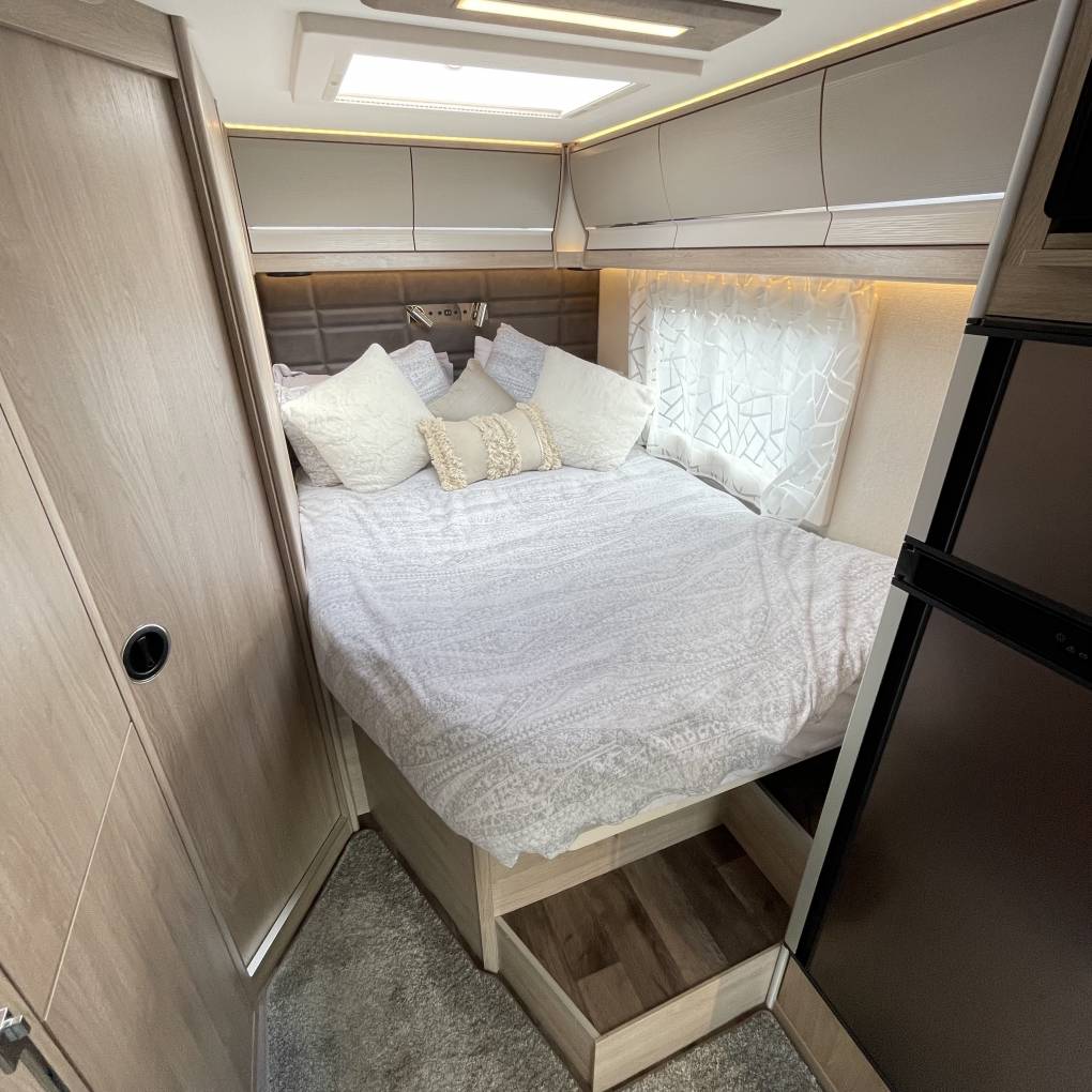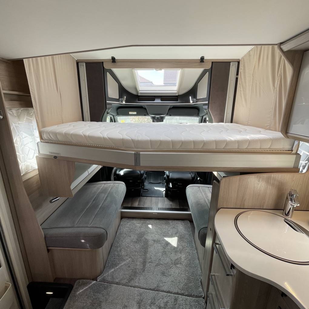 Above the lounge, the Travel Master comes with an electric drop-down bed, which disappears flush into the ceiling.The main bed is at the rear nearside and measures 1.98m by 1.40m. The bed’s base is hinged and rises on gas struts to reveal a services area underneath the foot, then a deeper storage space (accessible from outside) with headroom of 750mm thanks to a dropped floor level. A large step at the end of the mattress makes for easier access.