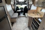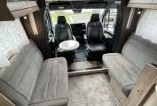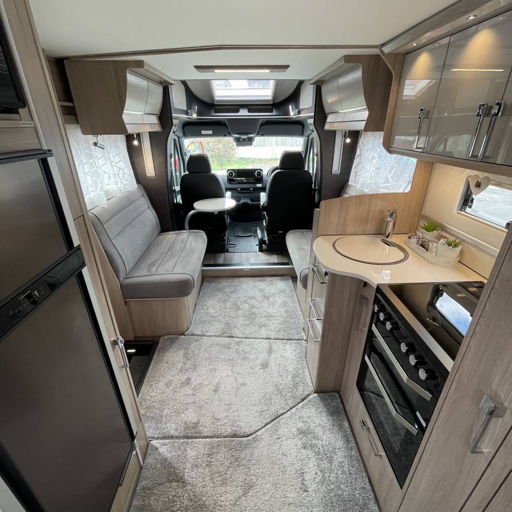 Inside, this Travel Master 560 feels especially open and spacious, with a generous front lounge that includes 2 captains seats. The free-standing dining table stores away in a cupboard next to the fridge and there’s an opening overcab sunroof. What’s really clever, though, is the way the offside sofa rotates to become a double passenger seat. As previously mentioned, the interior is warmed by Alde’s wet central heating but there’s also an underfloor heating system. But the Travel Master isn’t just for Swiss skiing trips; roof-mounted air-conditioning is there for the Iberian summers, too.
