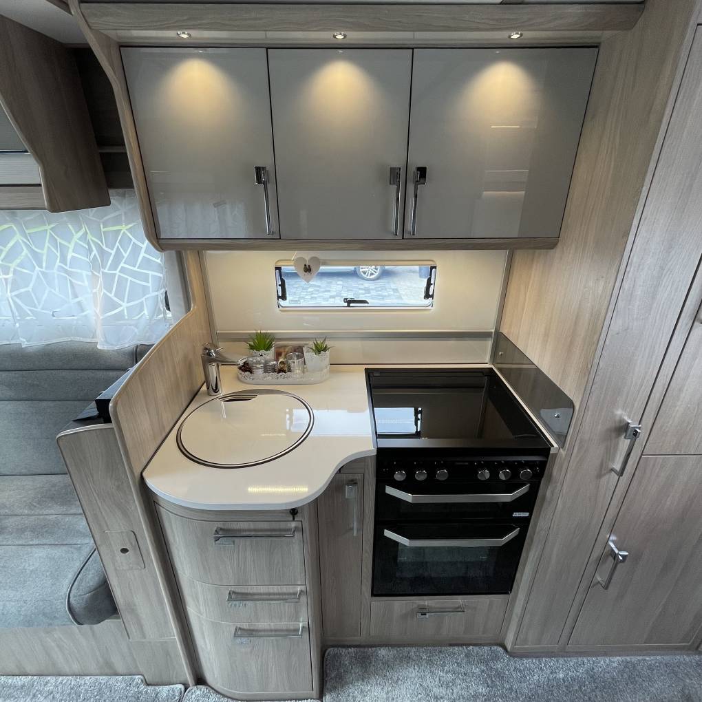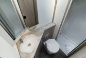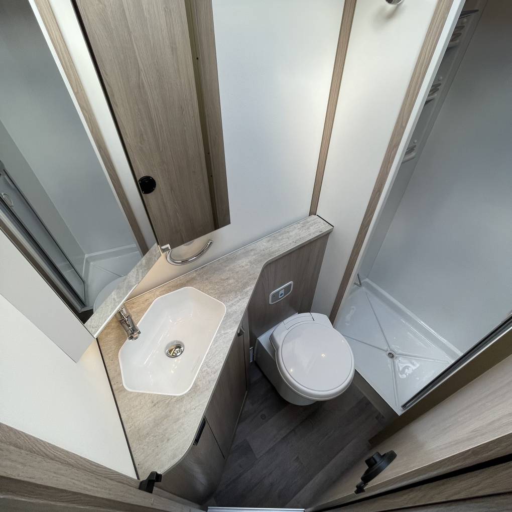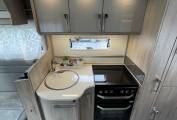 Forward of this area, the kitchen lives up to expectations, with a full cooker including a mains hotplate as well as a separate oven and grill. There’s even a fitted microwave above the 177-litre fridge/freezer. Clearly, the Coachman competes at the very top of the low-profile sector, with a unique Anglo-Scandi style.