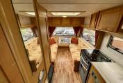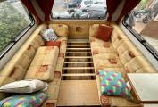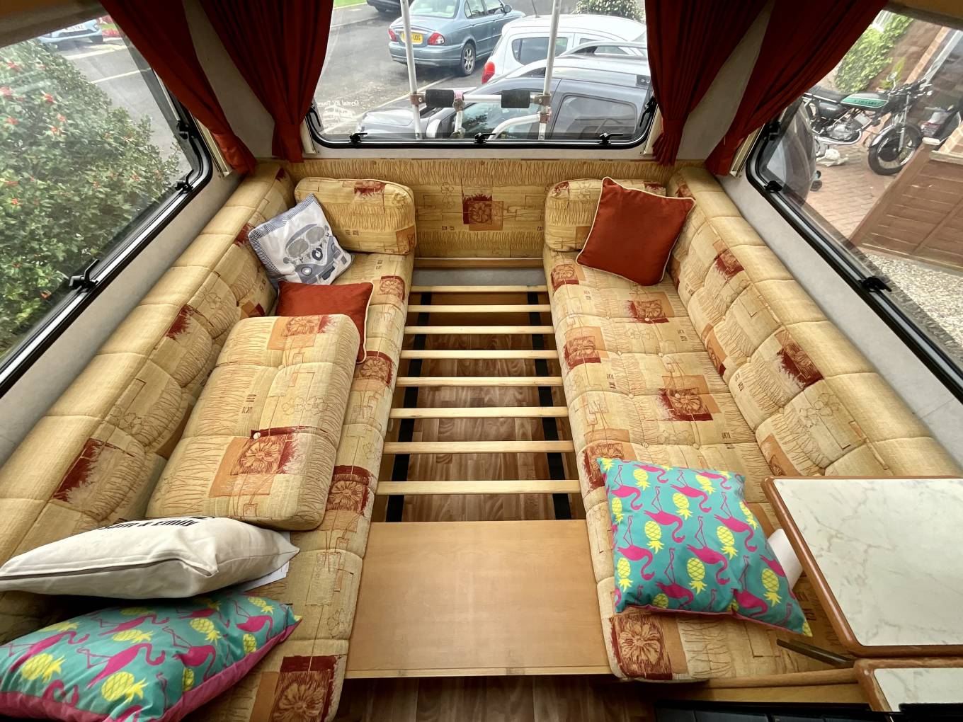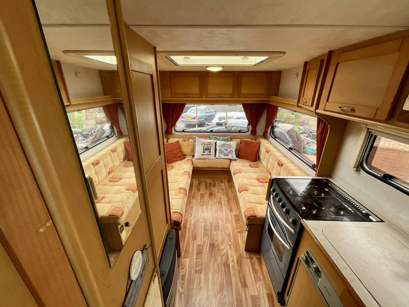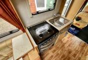 The kitchen area comes fully equipped with separate oven and grill, 3 way fridge and freezer, 4 gas ring hob, sink and drainer and a microwave. There is plenty of storage for condiments, cutlery and crockery.