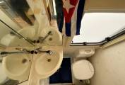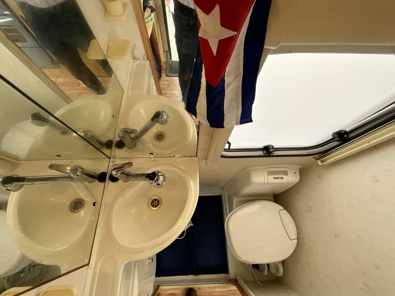 Opposite the kitchen area you have a combined bathroom with toilet, sink, shower, mirror and storage. You also have to the side a wardrobe for extra storage.