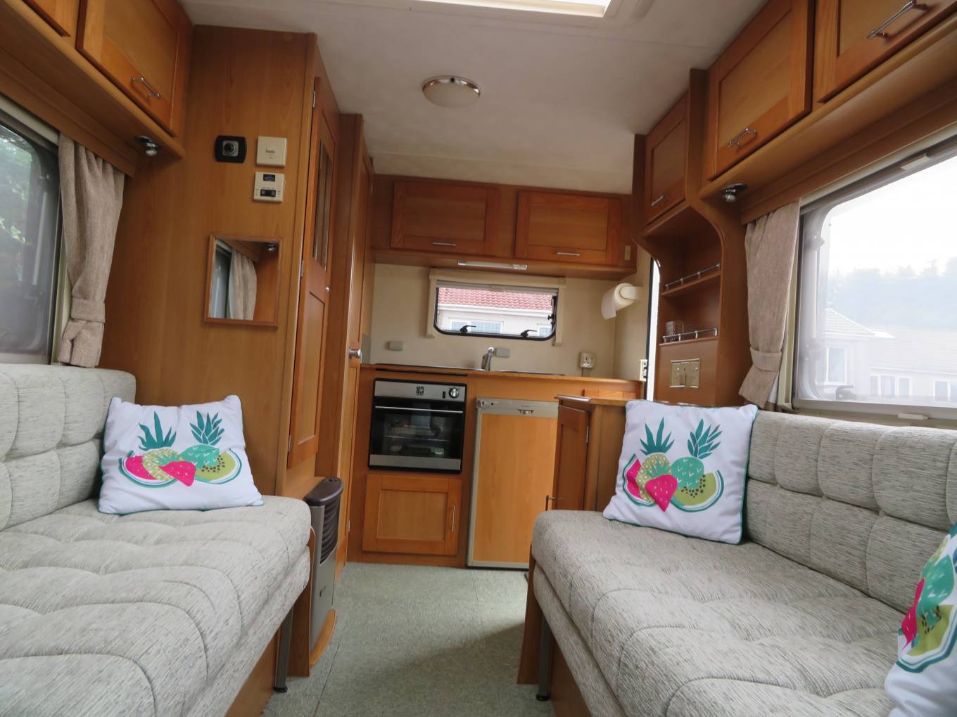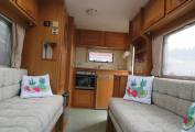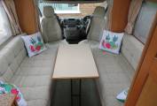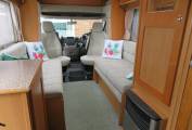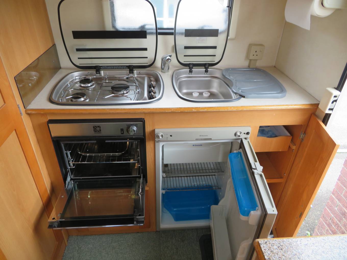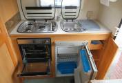 This popular compact van is entered from the near side via a manual pull out step the kitchen area is immediately on the right & consists of a large oval brushed metal finish sink with a chrome mixer tap. There is a full size oven and grill below the counter & a 3 burner gas hob above. The Dometic absorber fridge with freezer compartment that can be powered by 3 separate power sources, 240V 12V, Gas, depending on whether you are plugged in on site or wild camping.