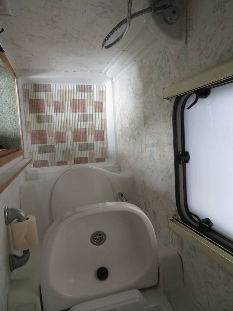 Moving round the bathroom is spacious & light is flooded in through a side window. The toilet a Thetford Cassette and has a fresh water flush. There is a wash hand basin that neatly folds down from above the toilet with Chrome mixer tap. The integral shower is separated using a shower curtain. In front of this there is a large hanging wardrobe space over the Trumatic Gas fire.