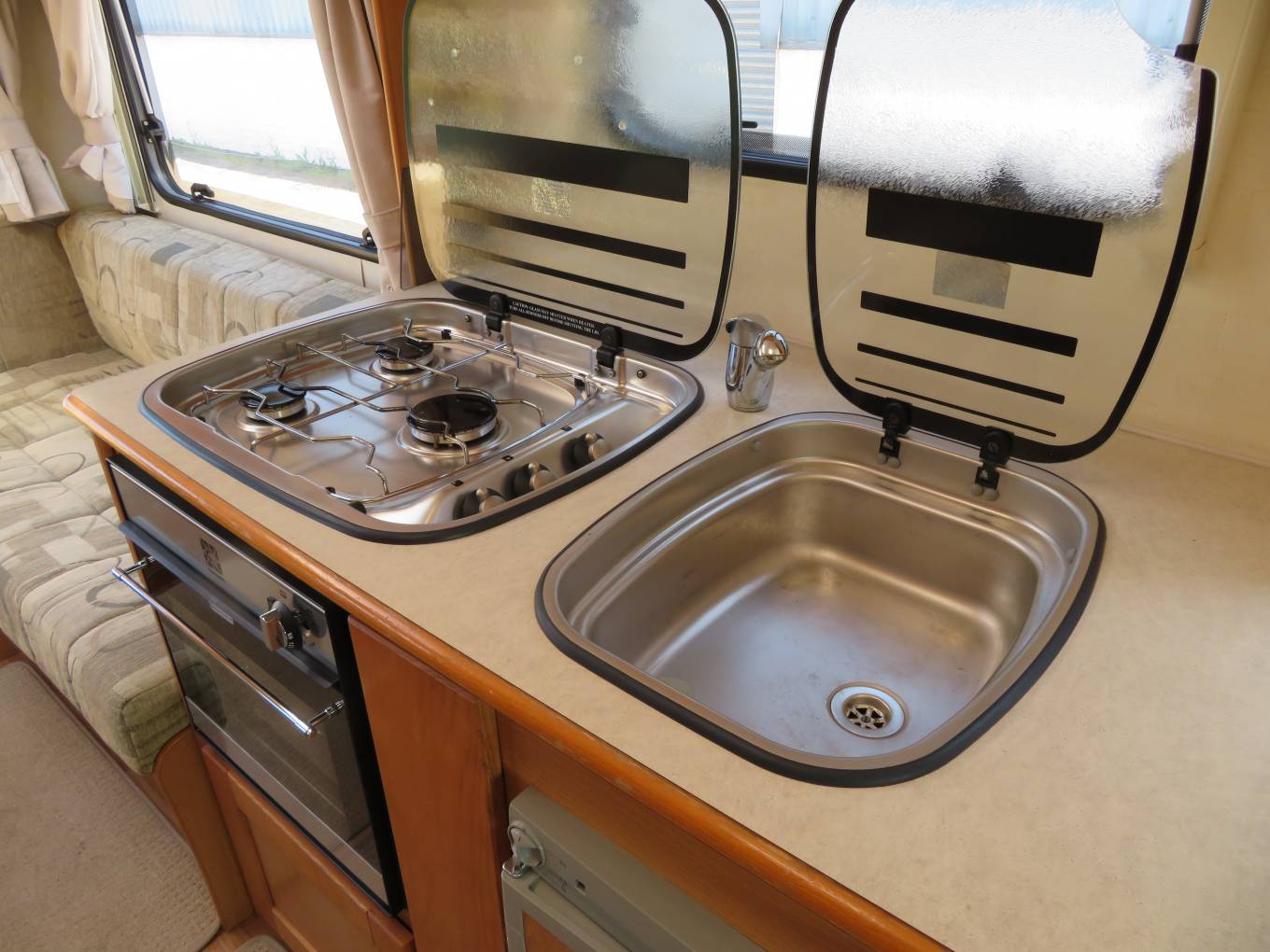Side Kitchen area equipped with a 3 burner hob, oven, Electrolux Fridge with freezer compartment and Sink