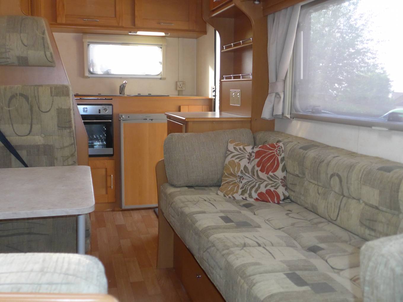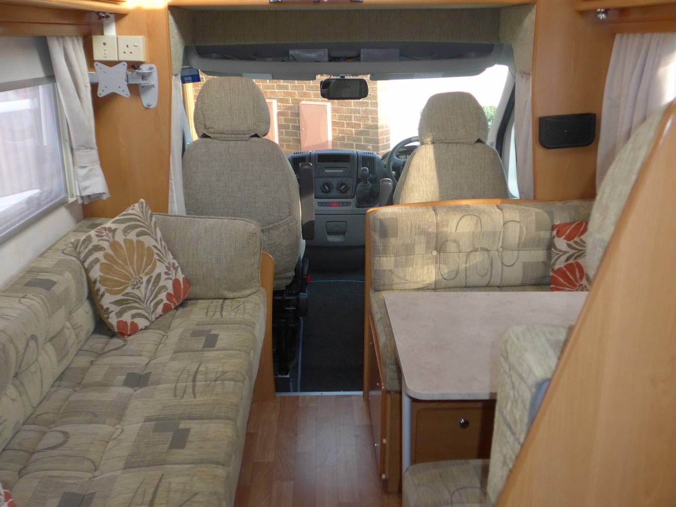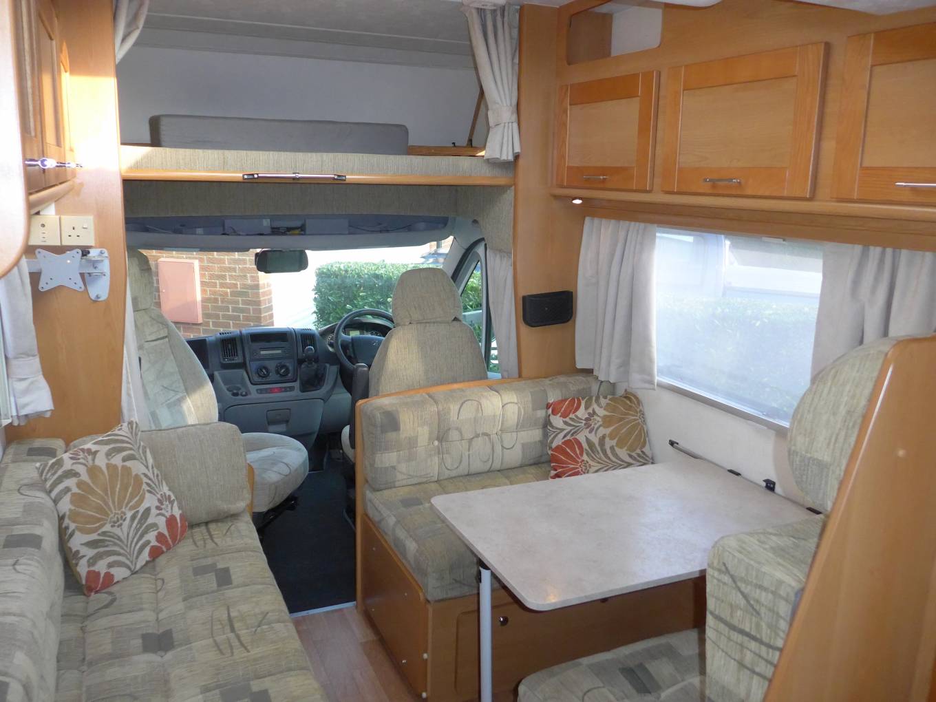 Centre Double Dinette with 2 forward facing travelling belts. This area converts to a double bed. A large side Sofa which converts to a 5th single bed. Tall Wardrobe with Status TV Ariel. 2nd Double over cab bed with Luton Ladder.