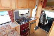 - Using the manual step to enter the campervan you have the kitchen/galley to your right, with a large stainless steel sink with draining board that has a wooden insert and a chrome mixer tap , a 4 gas burner hob with gas grill and oven beneath, a three-way powered fridge with freezer box, two pop-up additional counters, plus plenty of cabinets and cupboards to store-away your holiday provisions. There is plastic crockery and cutlery included.