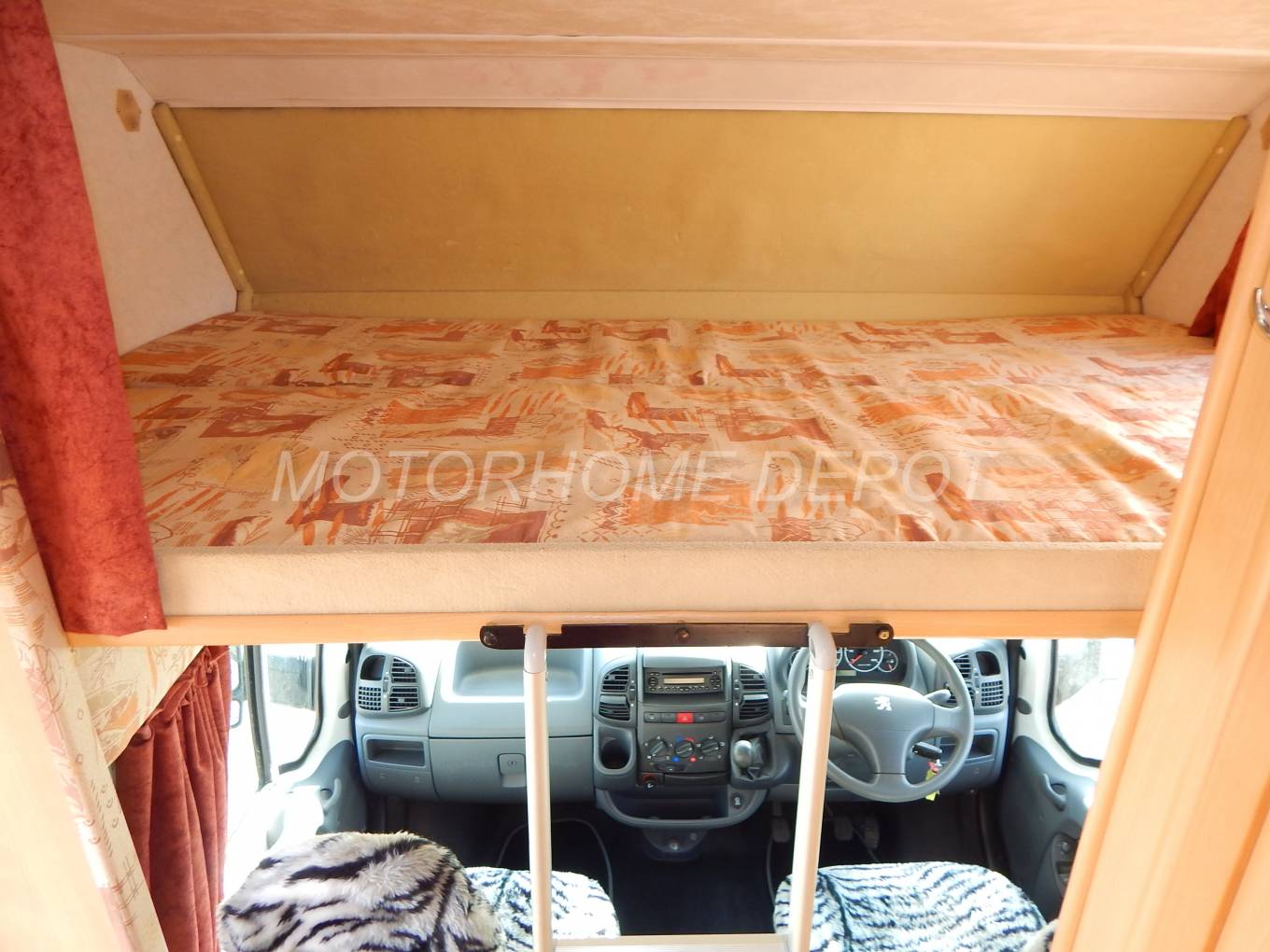 - The over-cab bed is accessed via an aluminium ladder, there is an opening window, privacy curtains, security net for children and a reading light. The bed pushes forward to allow additional headroom in the cab whilst driving.