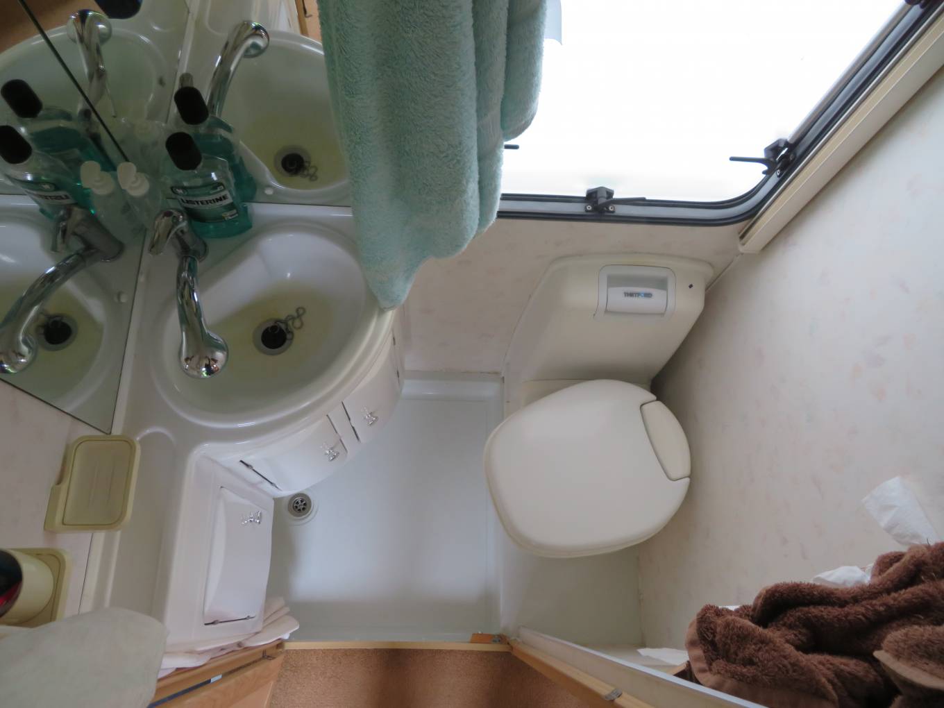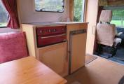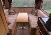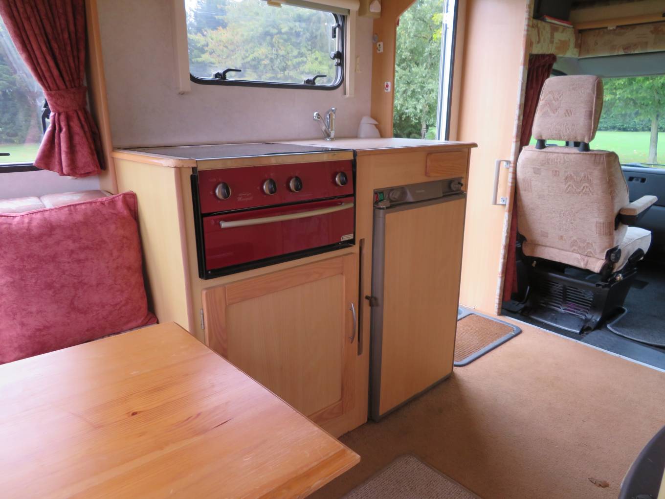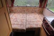 As you move forwards you come to the mid-kitchen which features a three gas burner hob, a grill, a 3 way fridge with icebox and a sink with a mixer tap. On the opposite side is the washroom which has a shower with the shower head built into the tap, a cassette toilet, a wash basin with mixer tap, a mirror and a bathroom cabinet so you have everything that you need to keep yourself fresh as a daisy. At the front you have a good size double bed above the cab which you access with a ladder and this can also be used as a storage area while you are travelling. A solar panel is fitted to ensure that you should have permanent power in your leisure battery.