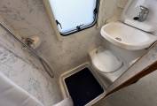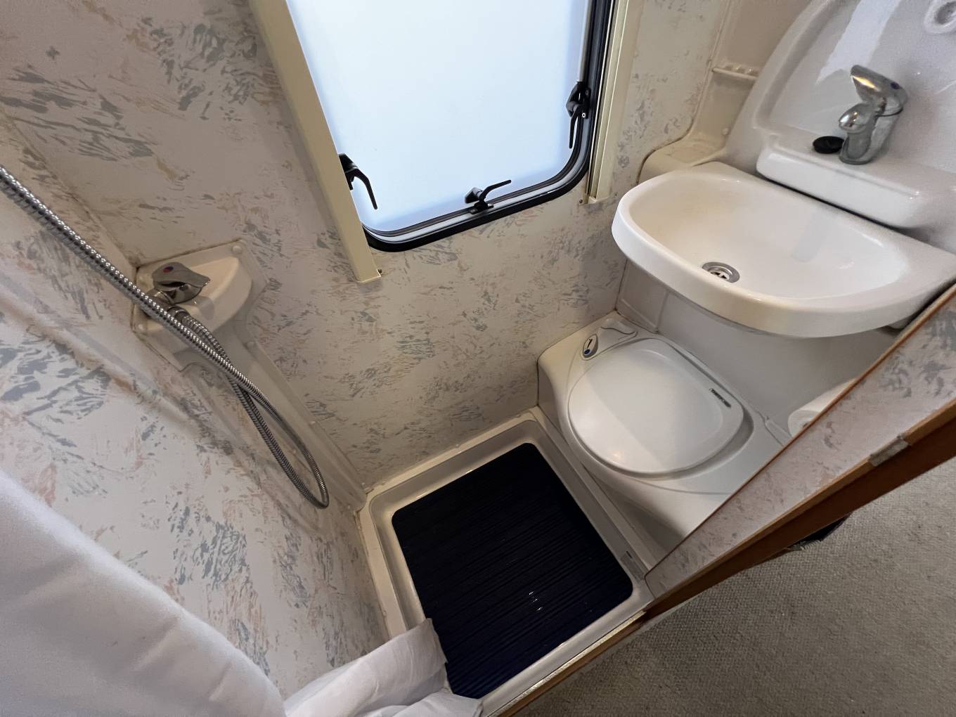 Opposite is the bathroom consisting of a Thetford Cassette Toilet, a space saving tip up Wash Handbasin and a Shower.