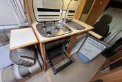 To your right as you come in, is the kitchen, where you will find a three Burner Gas Hob, an Oven Grill combination, a Dometic Three Energy Source Fridge, a Sink with a Mixer Tap supplying Hot and Cold water and a removable drainer.
