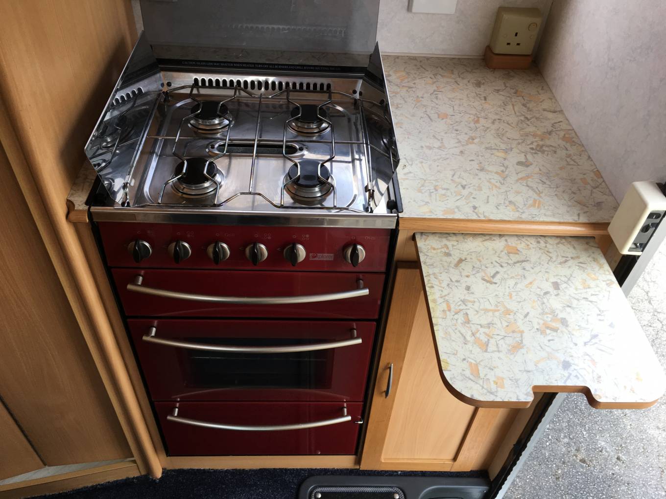 freezer and generous work tops including extendable work surface, the 4 gas burner hob, grill and oven is set to