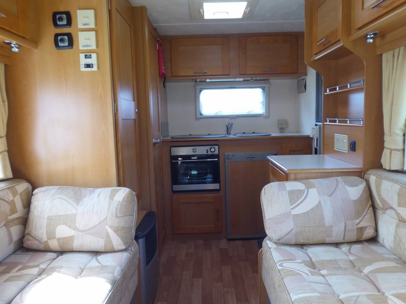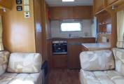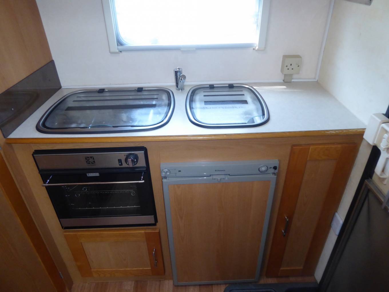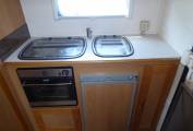 At the rear of the vehicle is the kitchen comprising a hob with three burners, a combination oven/grill, a sink, and a fridge with a freezer box.