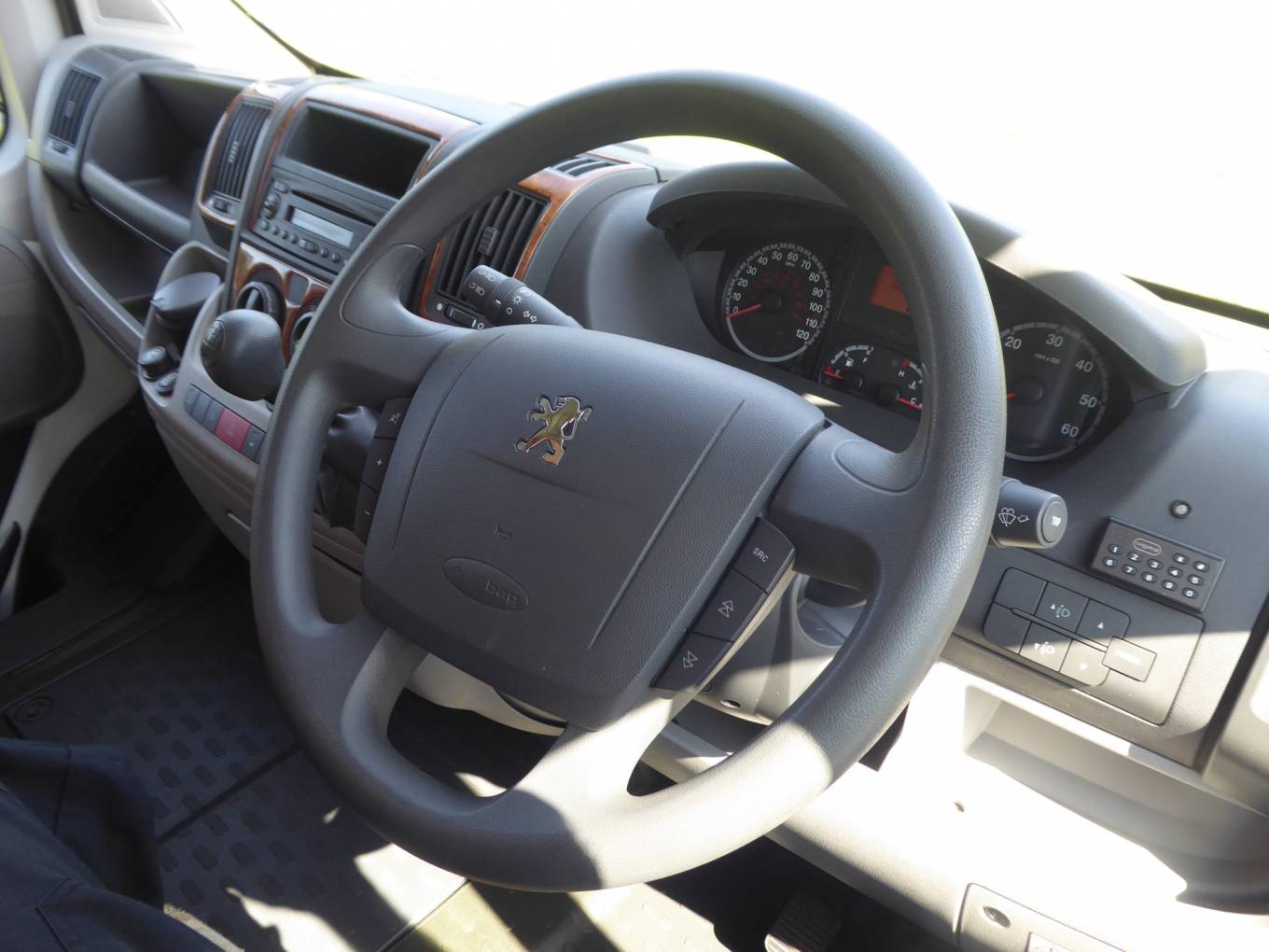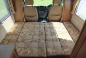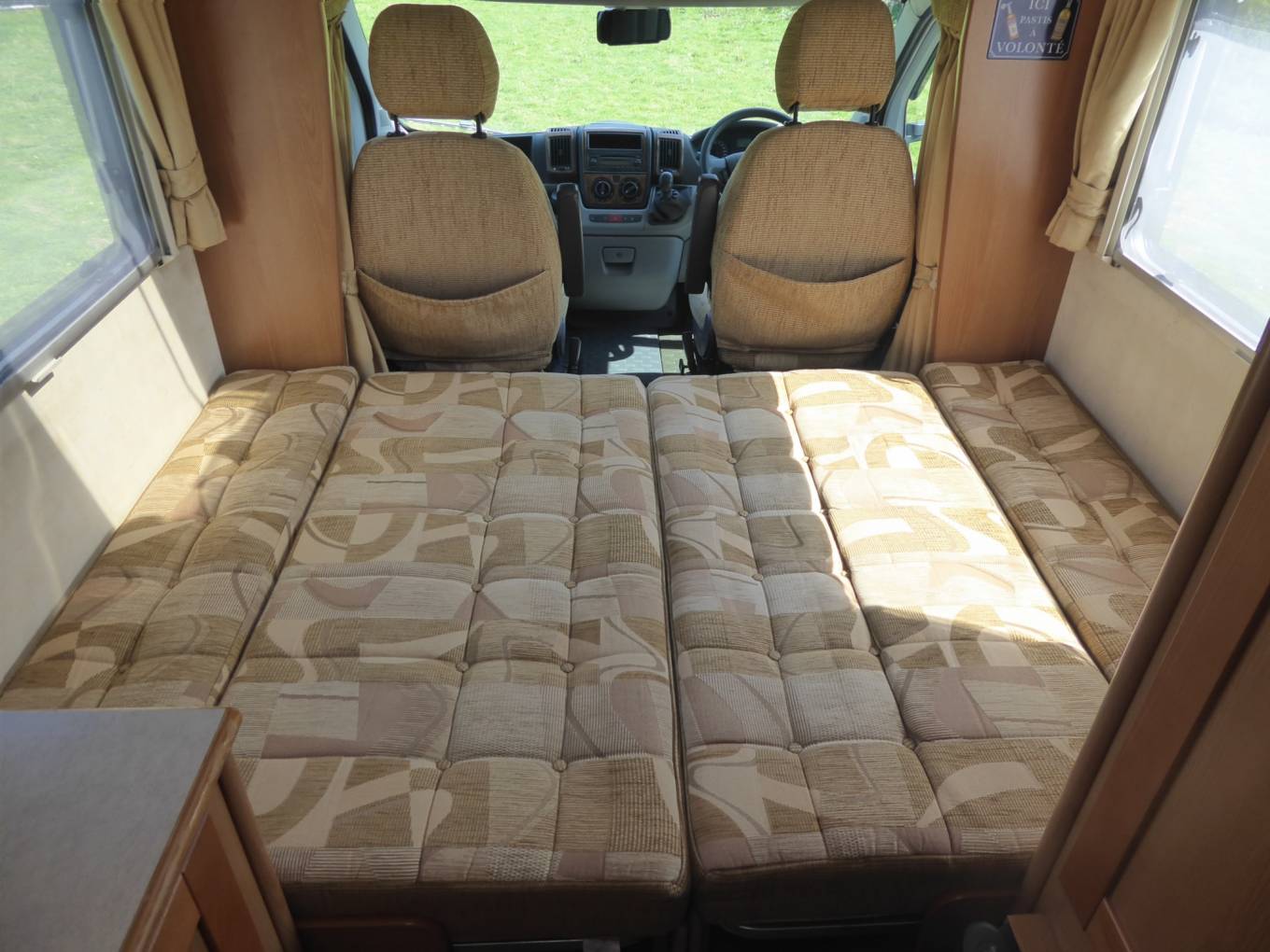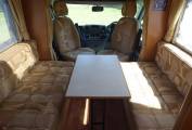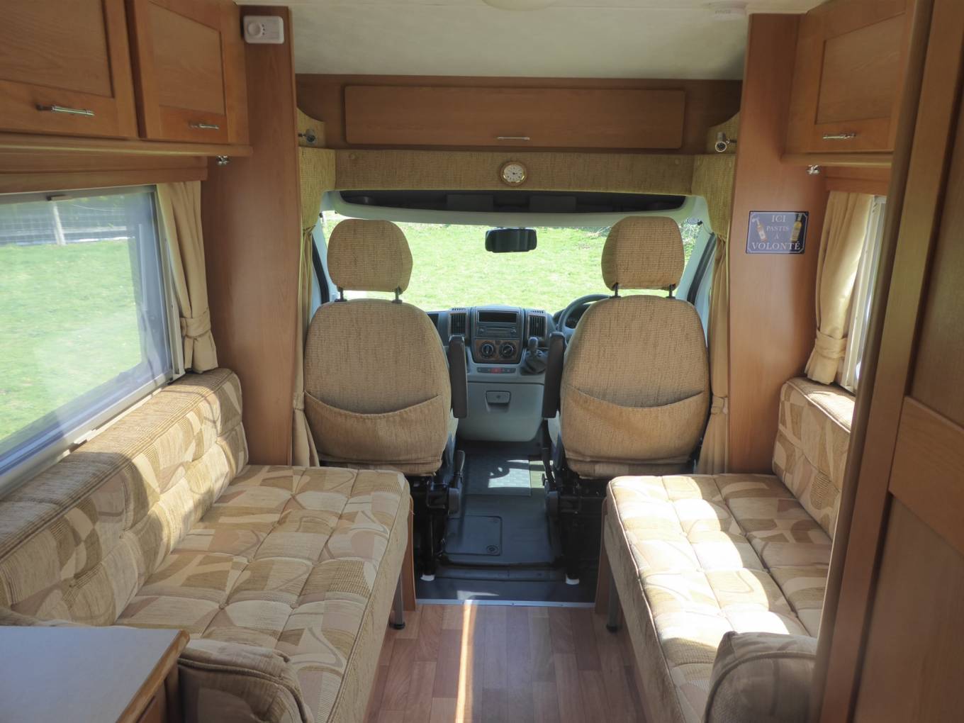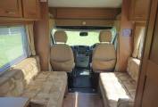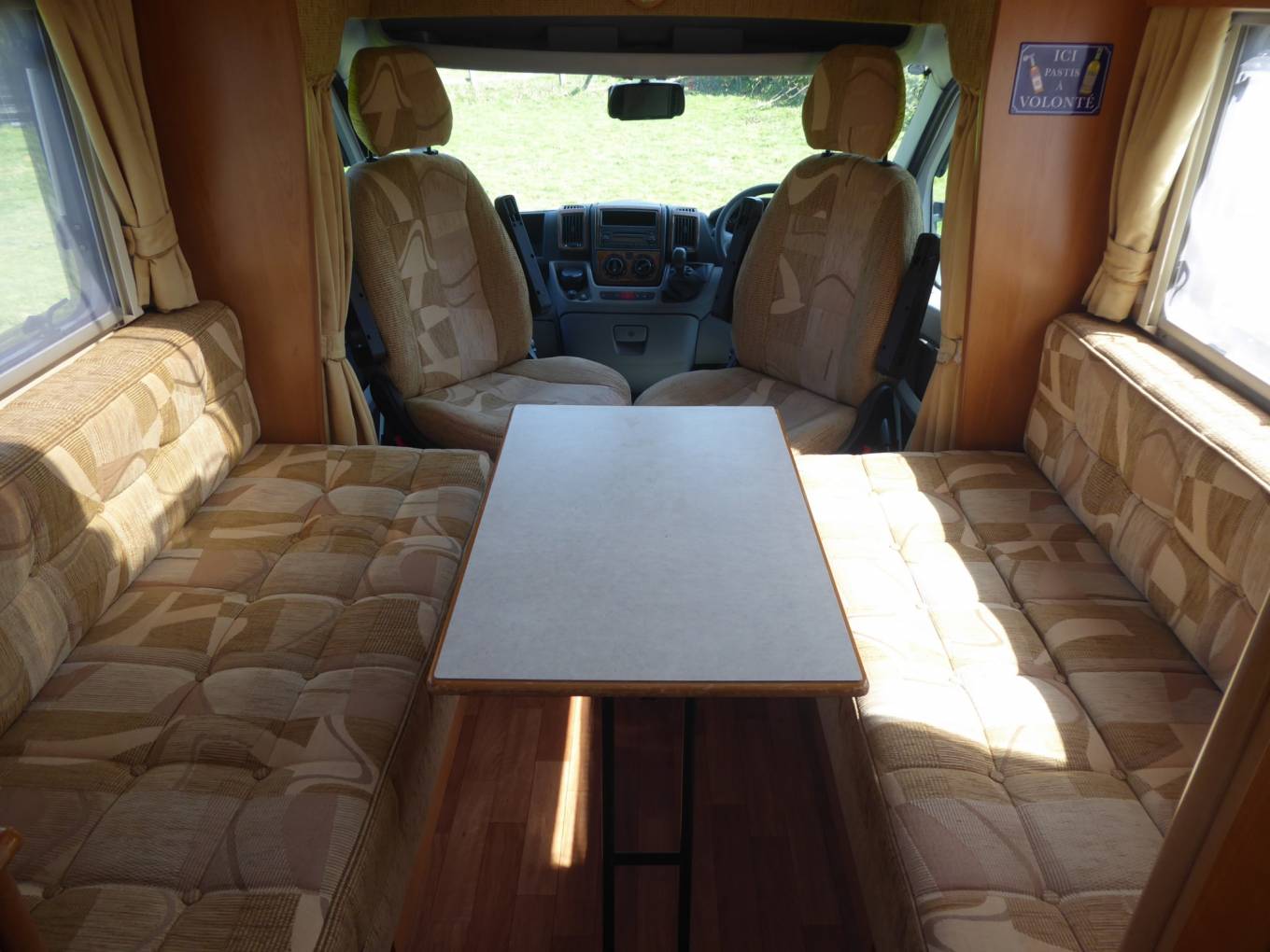 Behind the cab is the main habitation dining/leisure area with two opposing side bench sofas, with integrated upholstery in good condition. This area can be augmented with the use of a free standing table and the two swivel cab seats.