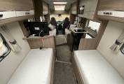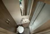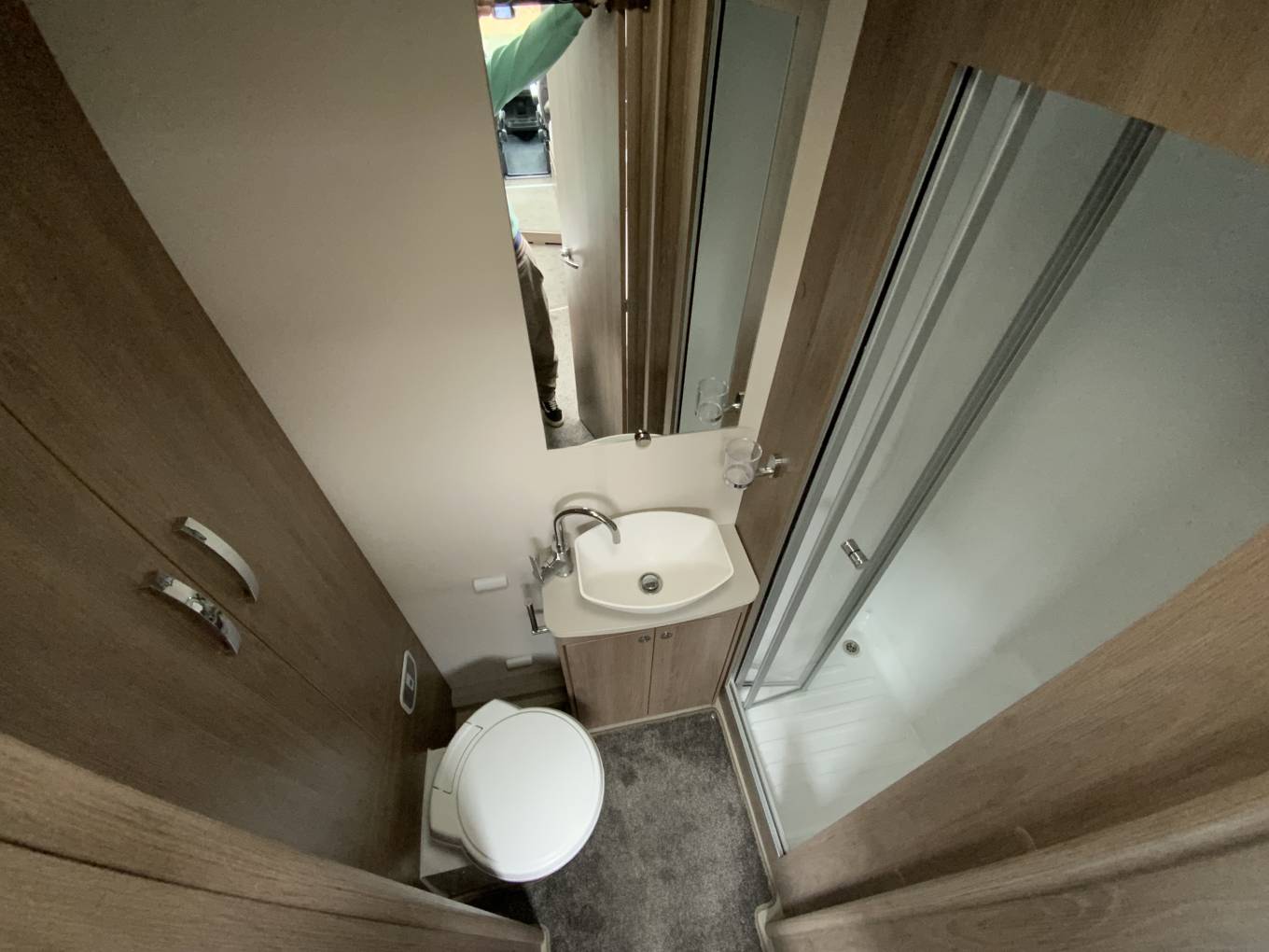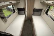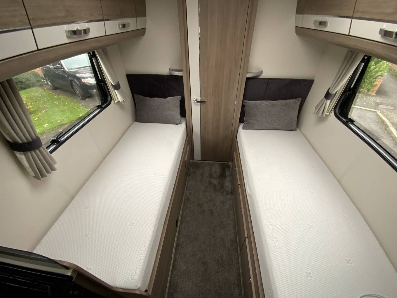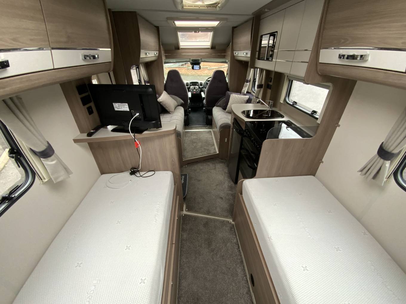 Moving towards the rear we have twin fixed beds which are big enough for two adults. At the very rear is a large washroom complete with cassette toilet, hand basin and separate shower cubicle.