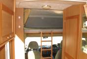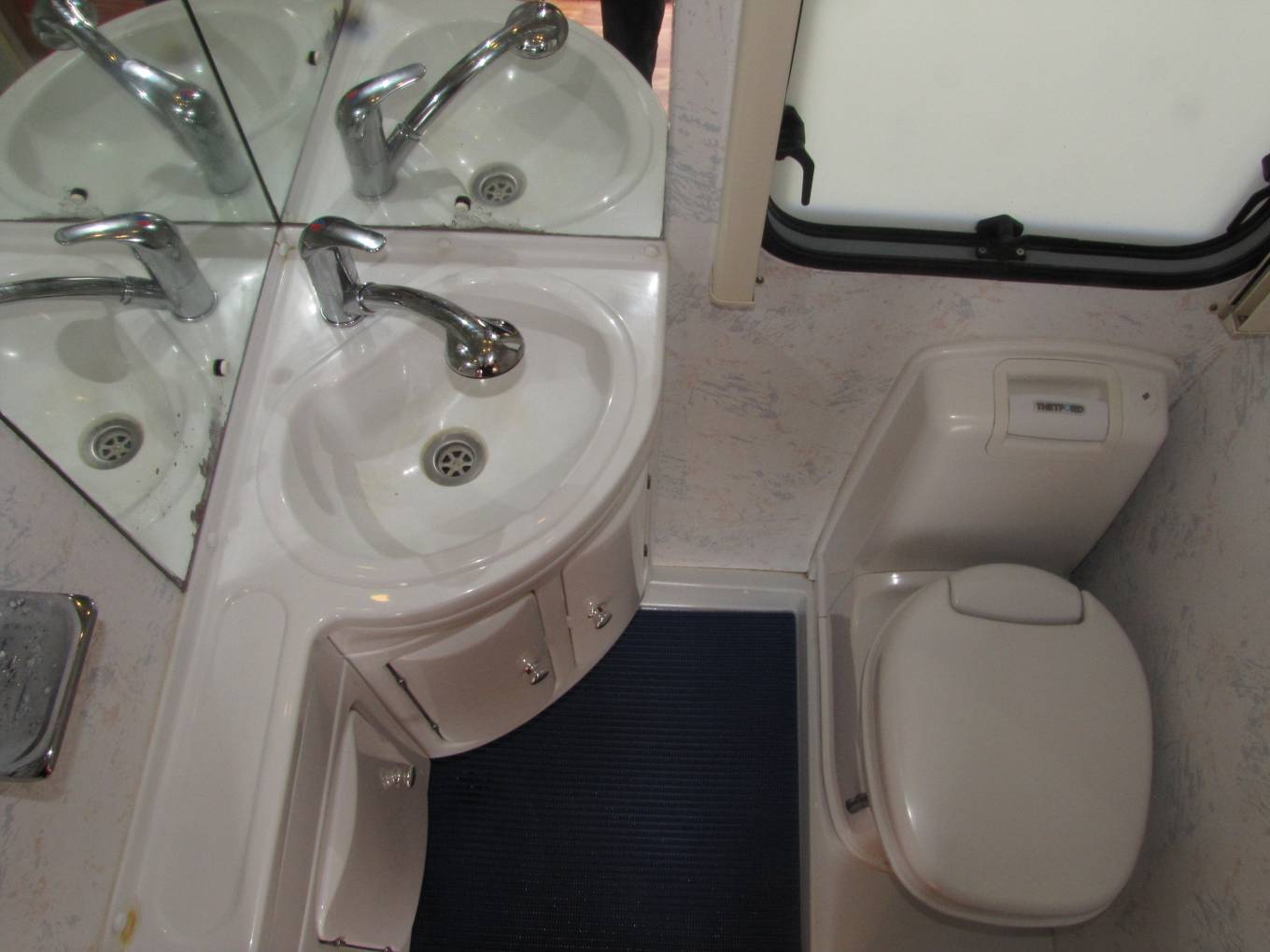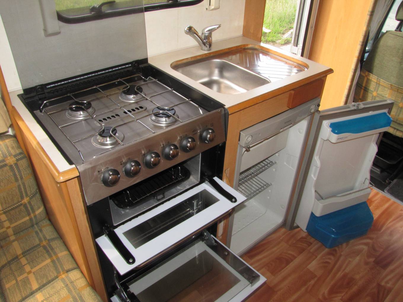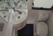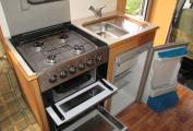 As you move forwards you come to the mid-kitchen which features a 4-gas burner hob, a grill, a 3-way fridge with freezer compartment and a sink with a mixer tap and drainer. On the opposite side is the washroom which has a shower with the shower head built into the tap, a cassette toilet, a wash basin with mixer taps, a mirror and a bathroom cabinet so you have everything that you need to keep yourself fresh as a daisy. At the front you have a good size double bed above the cab which you access with a ladder, and this can also be used as a storage area while you are travelling.