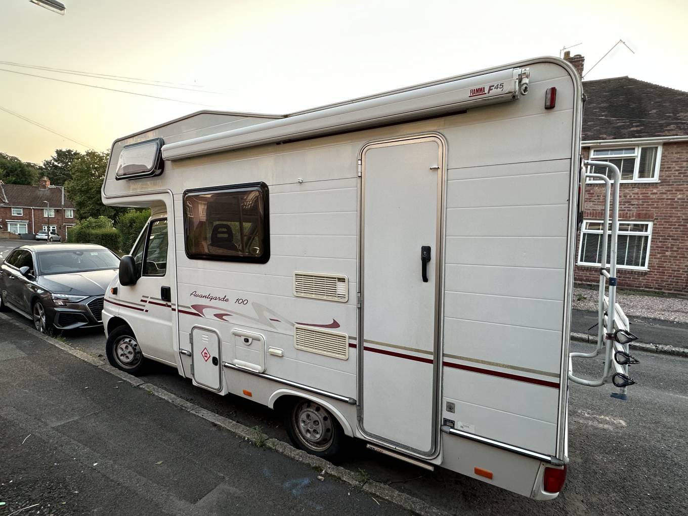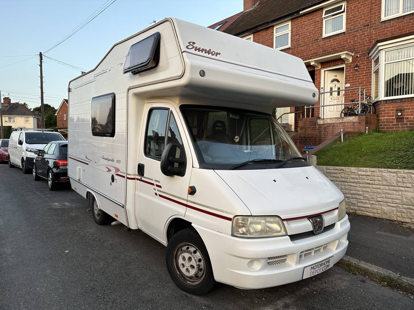 Motorhome Depot present this COMPASS SUNTOR AVANTGARDE 100 4 BERTH MOTORHOME. Starting with the kitchen area there's a stainless sink unit with drainer, mixer tap, 3 way combination Electrolux fridge freezer and an extendable work surface, the 4 gas burner hob, grill and oven is set to the side of the habitation door with further split level work surfaces and storage. Adjacent is the rear washroom with a flushing toilet, drop down vanity washbasin, opening window and shower. Moving on to the central seating area is a wardrobe storage locker located behind the front facing seats with a good amount of storage space, an adaptable fold away table, two large two seats which convert into a double sleeping area and the opposing sofa can also be used as a single bed. A good sized double bed is located in the overcab area. Specification includes, 4 seated travelling belts, lots of storage space, roof lighting and Truma heating and hot water. On the outside is a Fiamma F45 awning, manual entry step, gas locker with two bottles, and a triple cycle rack.