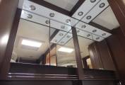 The rear of the vehicle provides a transverse U-shaped lounge (and two additional rear facing seat belts), located around an adjustable table for relaxed dining and leisure (may be converted for additional 2 berth sleeping area). Surrounded on three sides by wood slat Venetian blinds.
