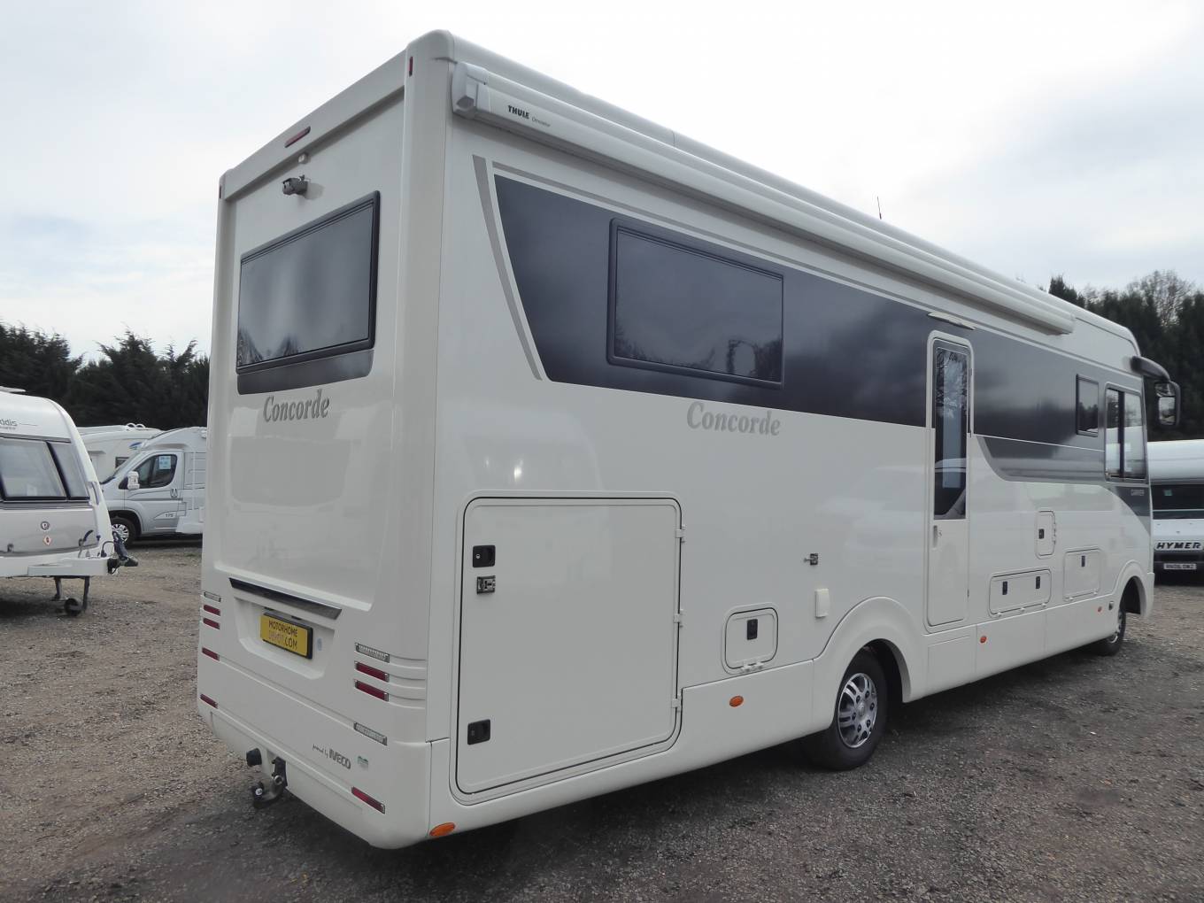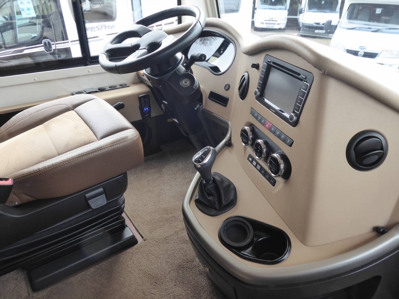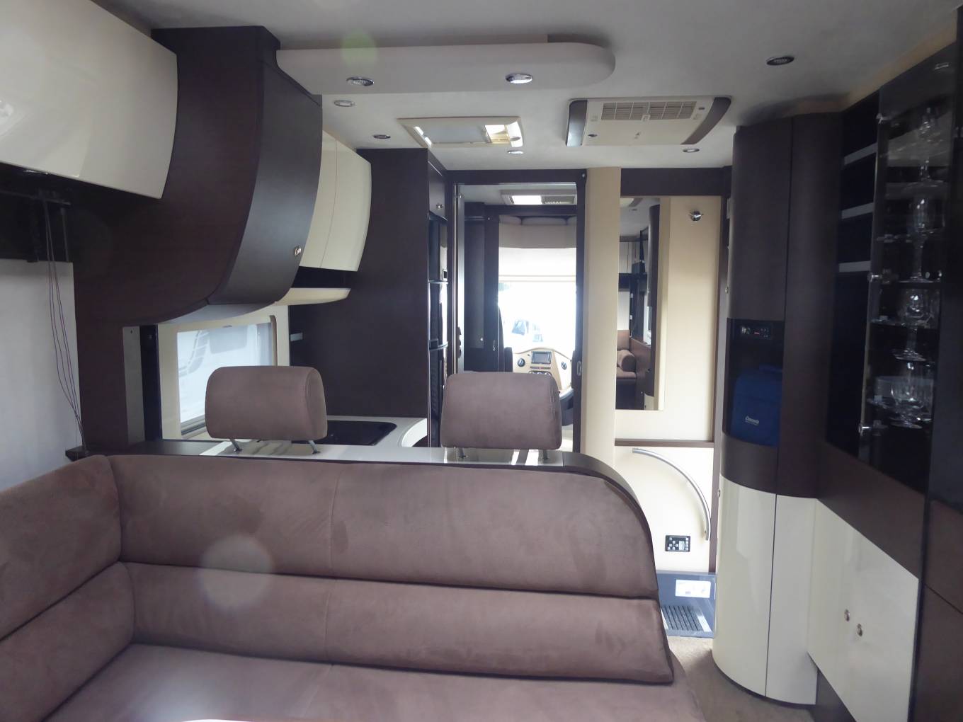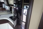 A spacious cockpit with UV screened panoramic windscreen providing excellent viewing positions for driving and pleasure, complemented by fully adjustable leather driver’s and passenger swivel suspension seating for optimum comfort. Individual extendible dining tables for each seat when reversed, with secondary entertainment screen viewable (unchecked). Concorde leather removable steering wheel.
