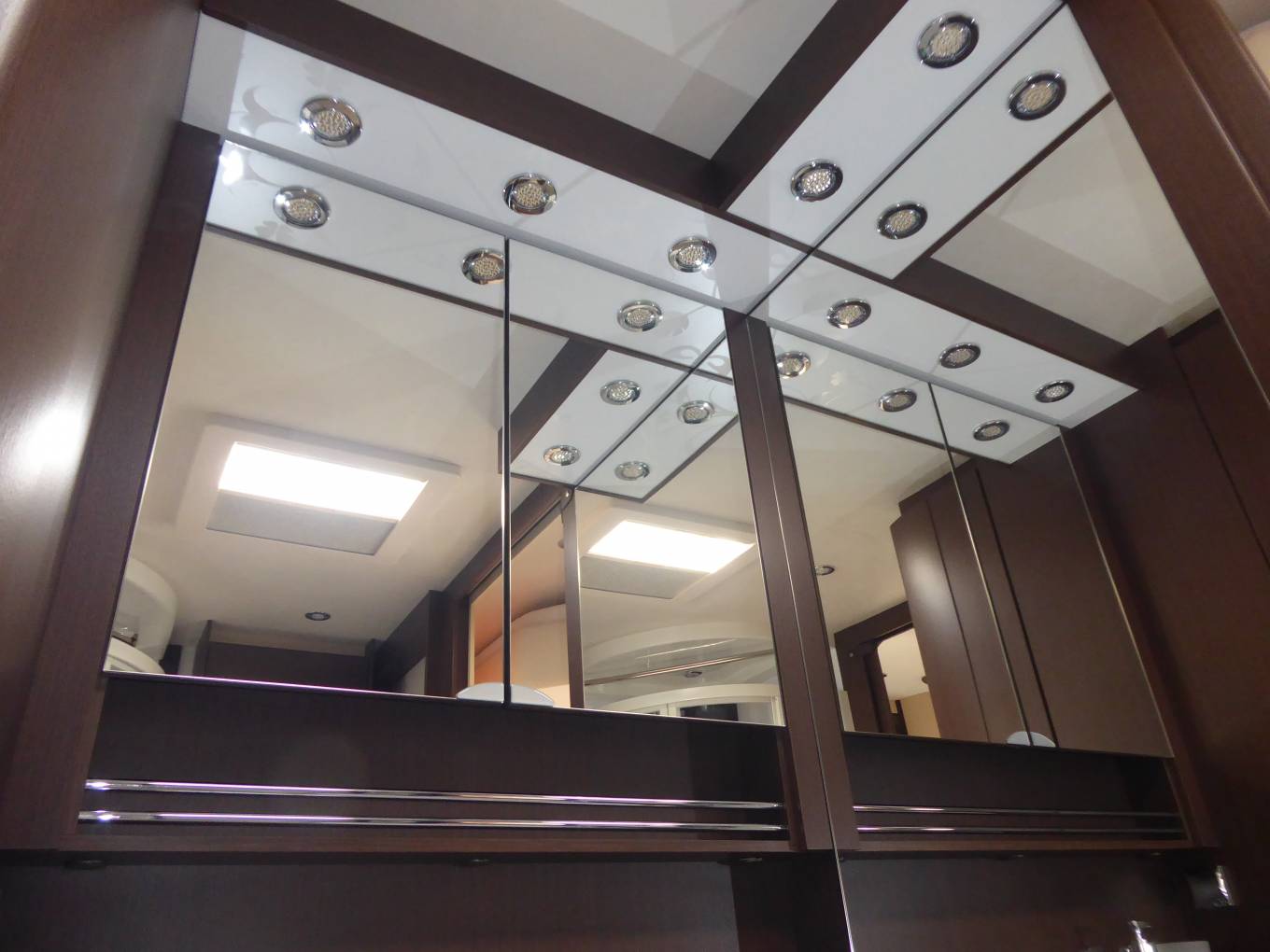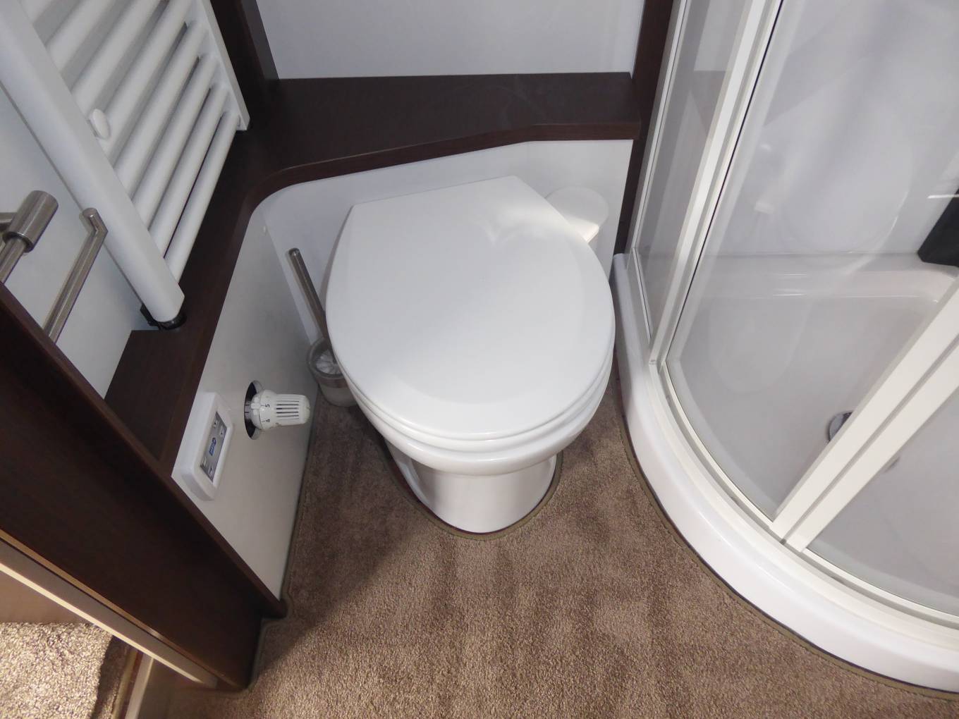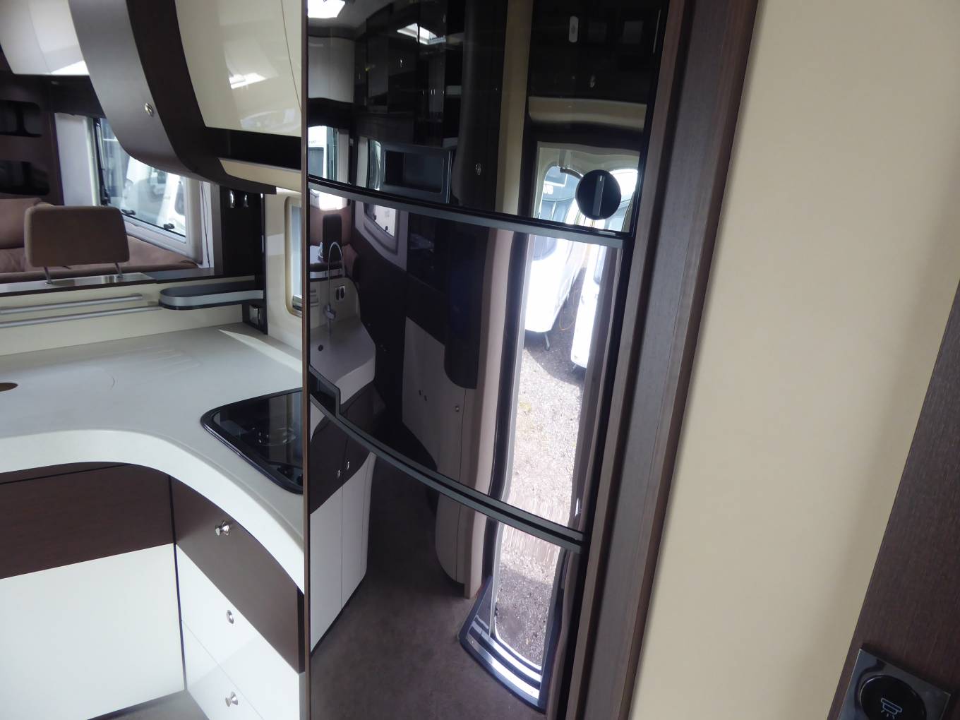 The premium central galley is located between the bathroom and the rear lounge above the central side access door. It features a mineral kitchen worktop with seamlessly moulded sink in ‘Marble White’. Fully equipped with a large fridge and separate freezer, an oven/grill, and a stainless-steel hob unit with three gas burners and glass cover.