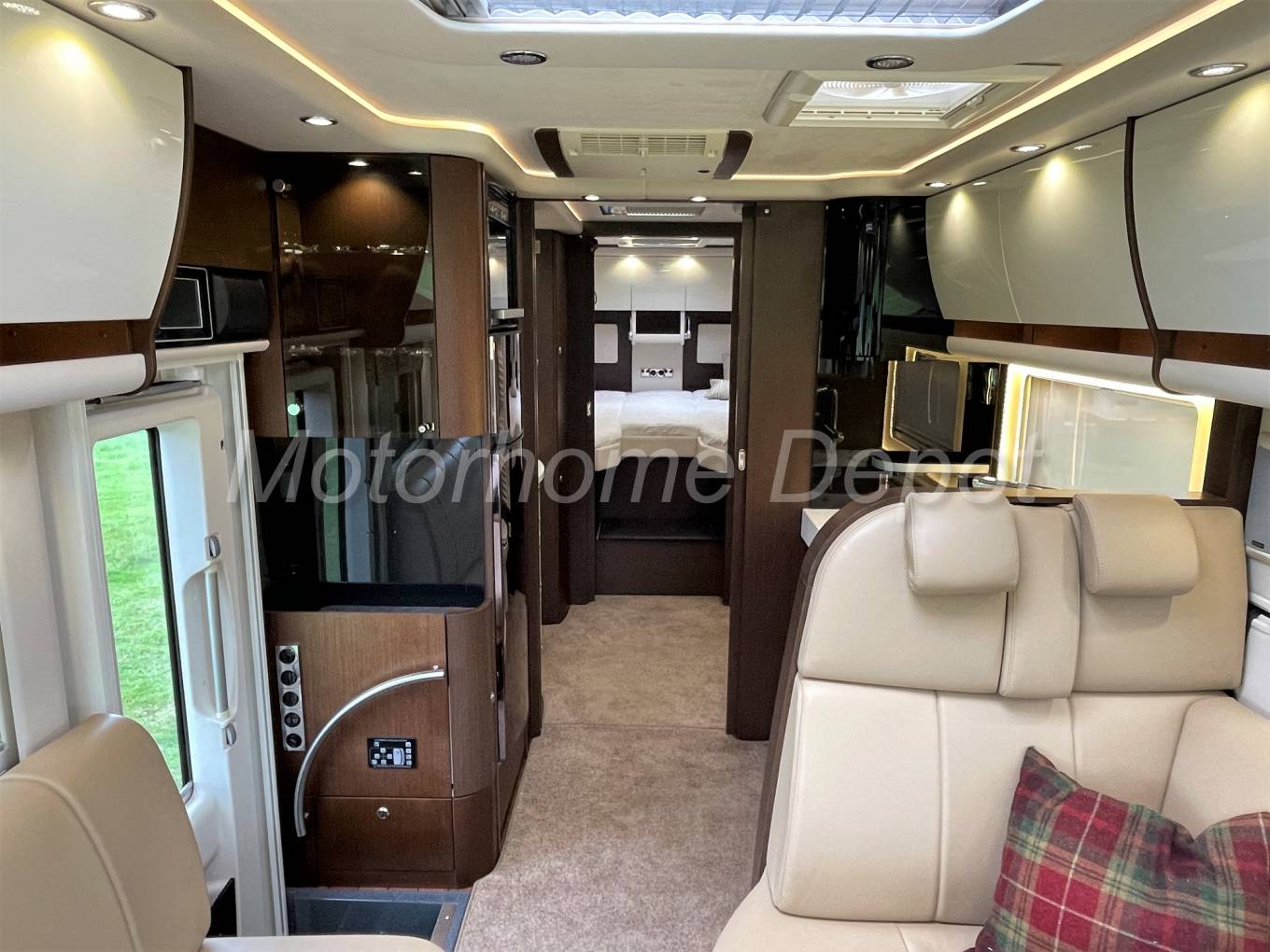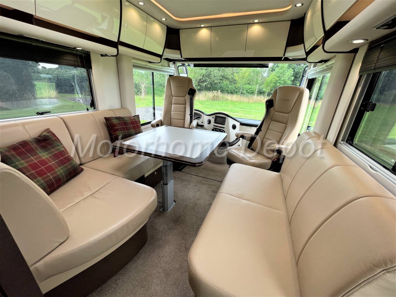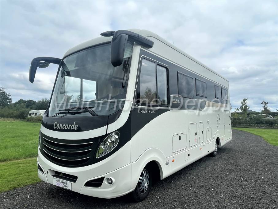 A rare opportunity to purchase one of the finest motorhomes that money can buy, Concordes Charisma 3 850 L. registered in 05/17 with only 2 owners from new and having only covered 34,208 miles. Supplied & fully maintained by Southdowns Motorhomes. Based on the ever popular Iveco 70C21 chassis, with Euro 5 emissions this 3.0 diesel engine develops 205 bhp, that with later ZF 8 speed automatic gearbox means it’s a joy to drive. The Cab benefits from; Blaupunkt multimedia head unit with truck software and 7.0” touchscreen, integrated radio with DVD, CD and MP3 playback, Bluetooth for telephone hands free & streaming, DAB upgrade to radio; Reverse camera screen with two views; 120L fuel tank; Aluminium rims front & Rear axles and widened spur to front; Concorde leather removeable steering wheel; climate control air conditioning; ASR; Cruise control; Black Leather trimmed dashboard; Electrically adjustable multi angle coach style mirrors; Coach wipers, Electrically operated 240volt drop down metal insulated cab front screen blind, Blinds to side windows, Privacy front screen (variable screening from inquisitive eyes, in up ward direction),