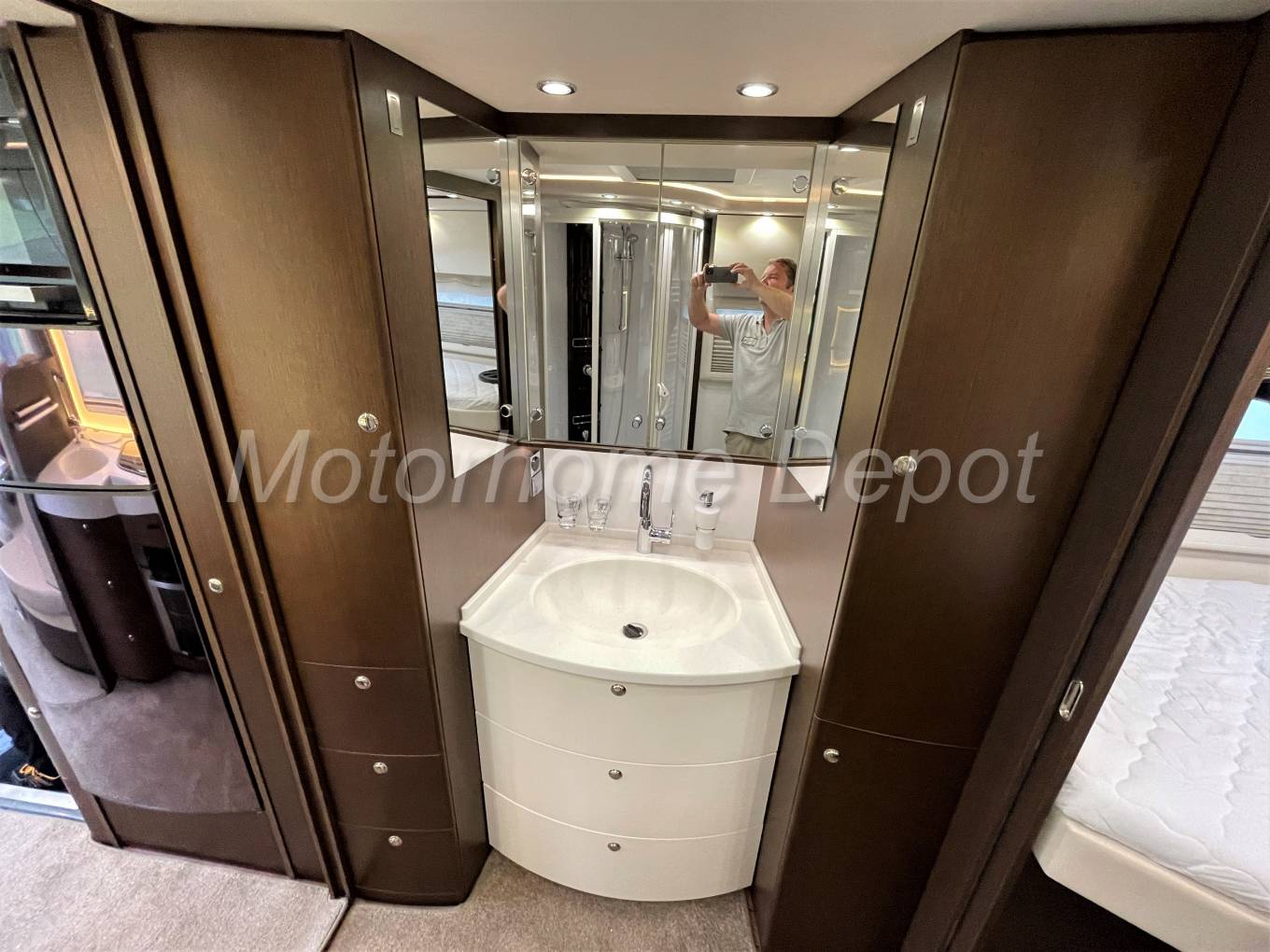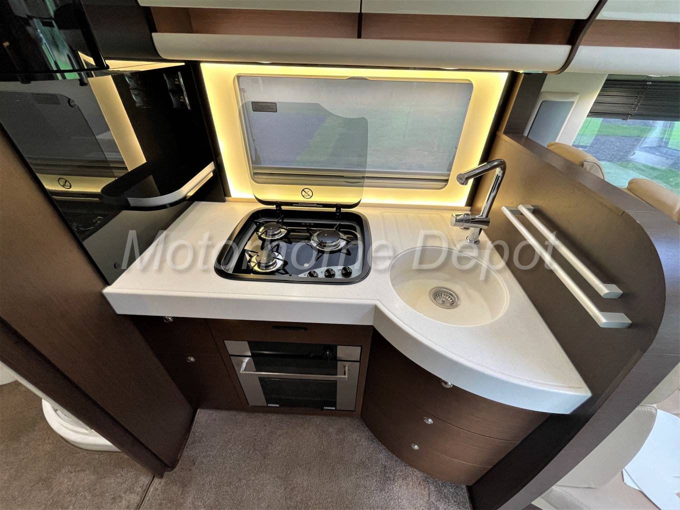 Large L shape kitchen with upgrade package consisting of: White Corian style single piece kitchen worktop with seamlessly integrated sink with extendible chrome mixer tap, Thetford 3 burner gas hob. Below the counter is Thetford Duplex stainless steel oven and grill. Opposite is the 190 L 3 way Dometic Absorber fridge freezer which can be powered by 240v, 12v or gas depending whether you are plugged in on site or wild camping. There is ample cupboard and drawer space for all you cooking utensils.
