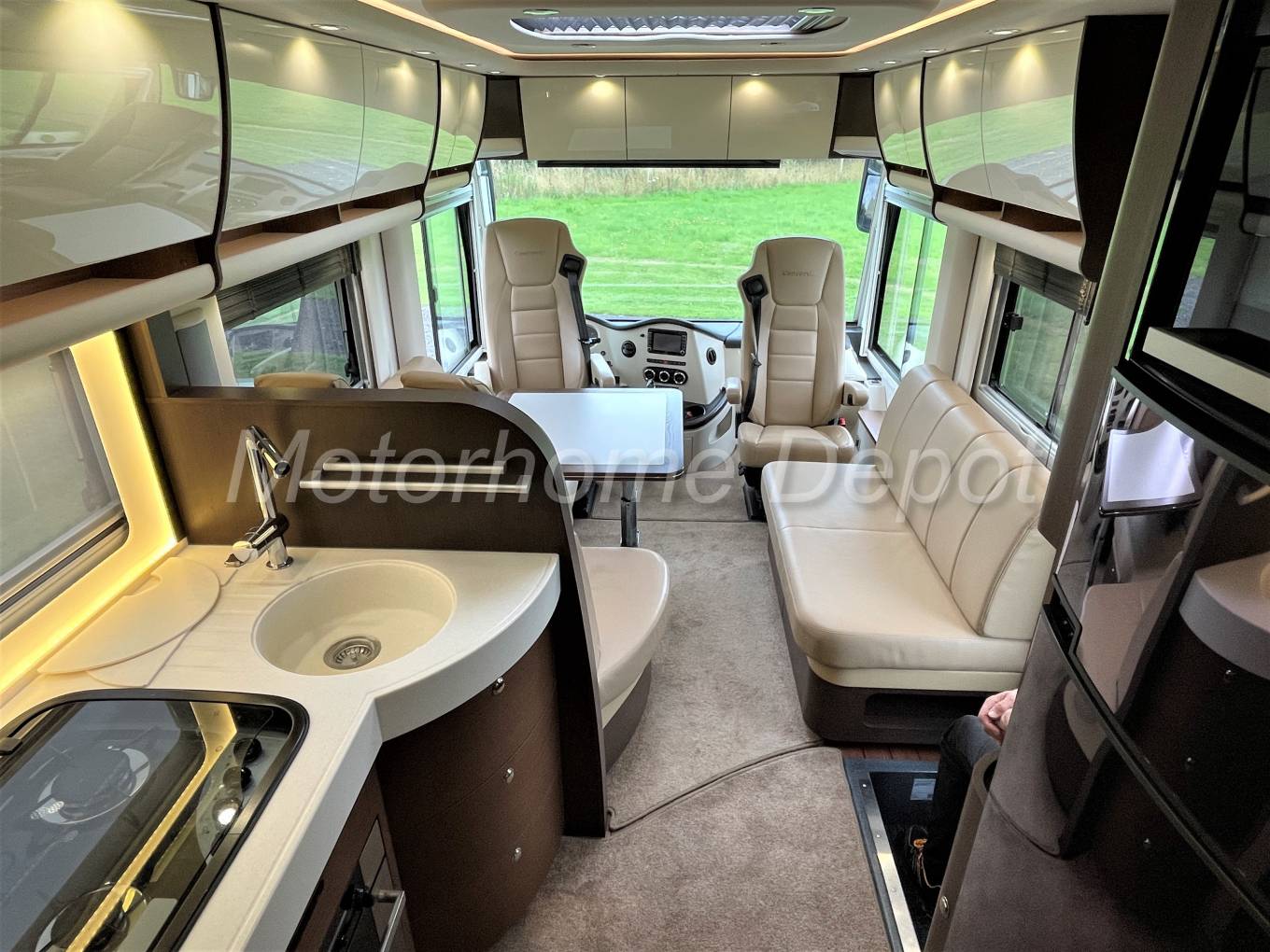 We enter the motorhome on the Drivers side, immediately to the right of the habitation door is a large two seater sofa, opposite is the dinette with an L shaped sofa the forward facing section having 2 x 3 point lap & diagonal seatbelts for travelling passengers. The table is fixed to the floor and can be moved centrally. The front two seats rotate to join this area so you could easily 7 people if entertaining on site. At night the table drops down and with the use of an infill cushion you can make this area into a small double bed. There is a TV point with 24” Flatscreen Alphatronics digital TV by entrance door, Ceiling-high glass-fronted cabinet,