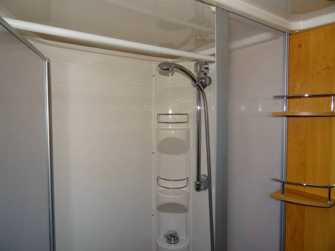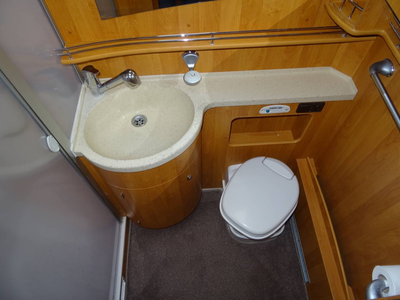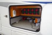 The washroom has a fully enclosed shower cubicle, a vanity wash basin, Thetford SOG w/c, mirror, and good storage space. The bedroom and washroom area have a sliding door to give complete privacy from the living area.