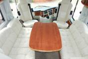 We enter the motorhome on the Drivers side immediately to the right is the large dinette with Twin swivel multi adjustable cab seats with air suspension, lumbar support and heating, Large side sofa, Large multifunctional L shape sofa with 1 additional seatbelt, Height adjustable dining table and cushion (to create extra berth), Soft-look leather upholstery in ‘Mother of Pearl’, Laminate wood flooring throughout, large Avtex Digital TV by entrance door, Ceiling-high glass-fronted cabinet next to entrance door with assorted glasses, Blue LED strip lighting and Panoramic skylight with lighting.