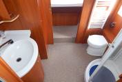 Sliding partition door to large Premium bathroom with Porcelain toilet with macerator and 230 litre waste tank, Large shower unit with twin sliding shower doors, Vanity unit with Mineral sanded cream top and seamlessly integrated washbasin, Extendible mixer tap, Slide out under worktop towel rails, Mirrored wall cabinet, Heated towel rail, Large wardrobe, Small Heki roof light and Sliding partion door to rear bedroom.
