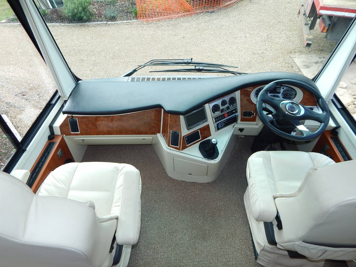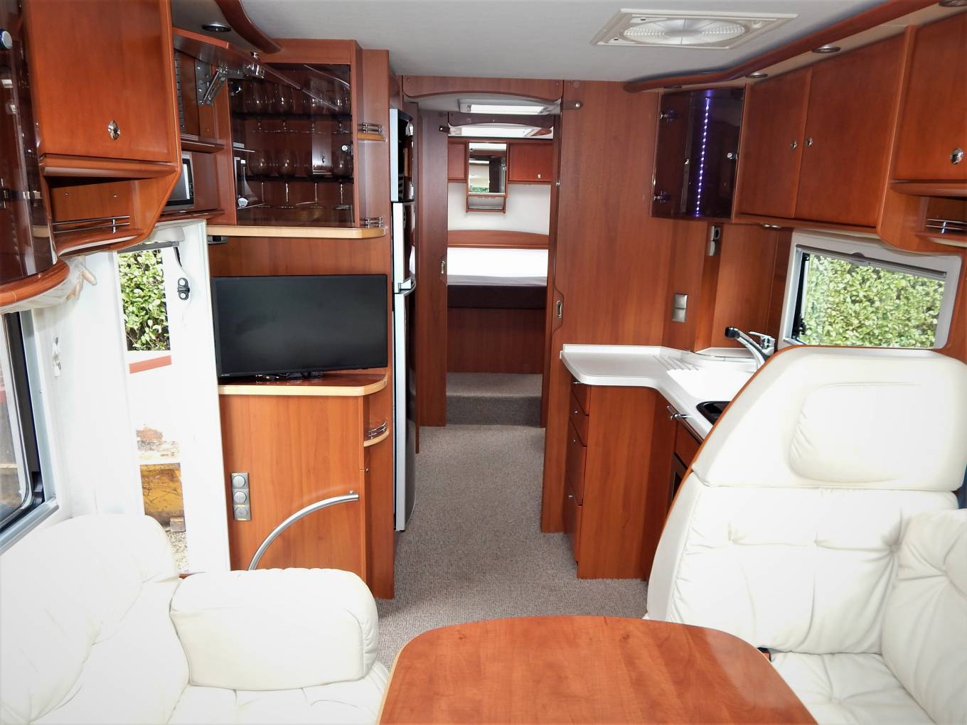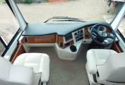 The Cab: Thatcham 1 alarm system, Chassis package for Charisma Daily - Chassis upgrade with 6700Kg GVW, Dual bi-xenon headlights with cleaning system and additional high-bean headlights, Directional indicators with LED day running lights, 160L fuel tank, Aluminium rims on front axle and widened spur / wheel trims on rear axle, Concorde exclusive steering wheel. VB Full air suspension, Cab air conditioning, ASR, Cruise control, Waeco Twin lense reversing camera with 7” colour monitor, Wood effect dashboard, Electrically adjustable coach style mirrors, Coach wipers, Electrically operated 240volt drop down metal insulated cab front screen blind, Blinds to side windows, Privacy front screen (variable screening from inquisitive eyes, in up ward direction), Alpine CD/DVD/Radio unit. The second double bed is pulled down from above with Lattoflex suspension with Privacy curtains and Small Heki roof light.