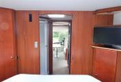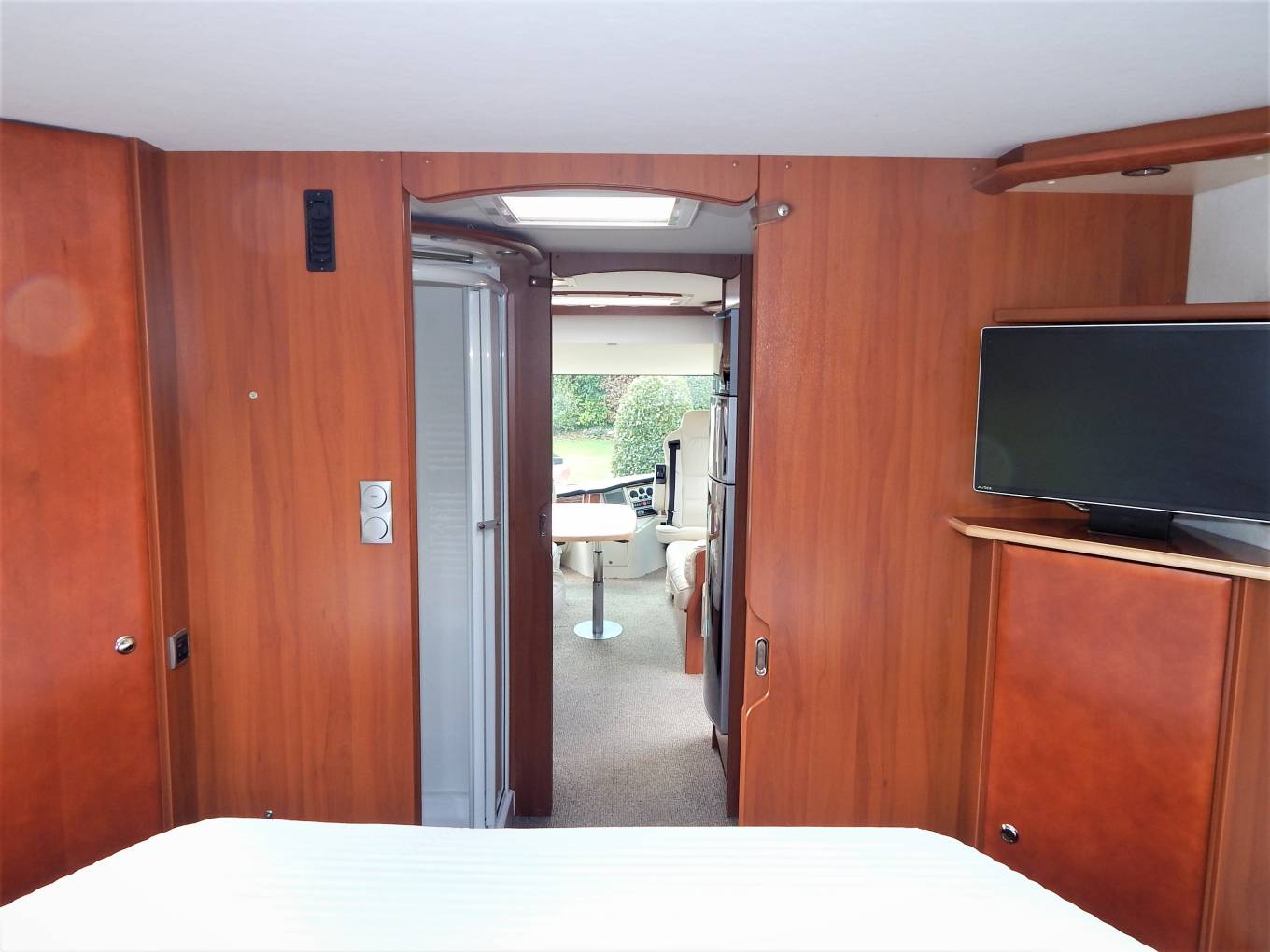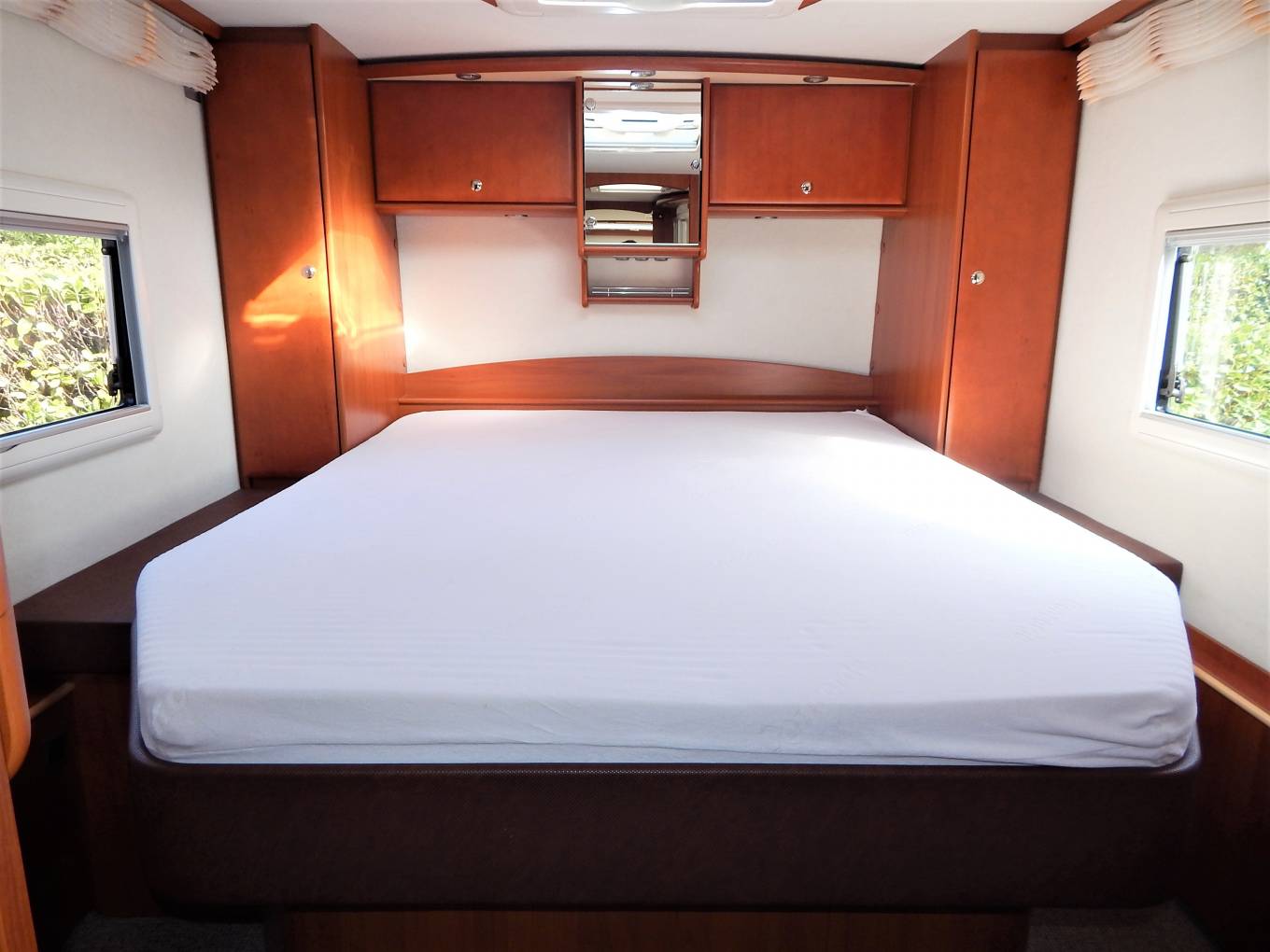 Large rear bedroom with Island double bed with adjustable bed head, Twin side wardrobes, Corner full height storage cupboard, Panoramic skylight with lighting in bedroom instead of standard skylight and Corner unit with Avtex 18.5” TV with DVD player.
